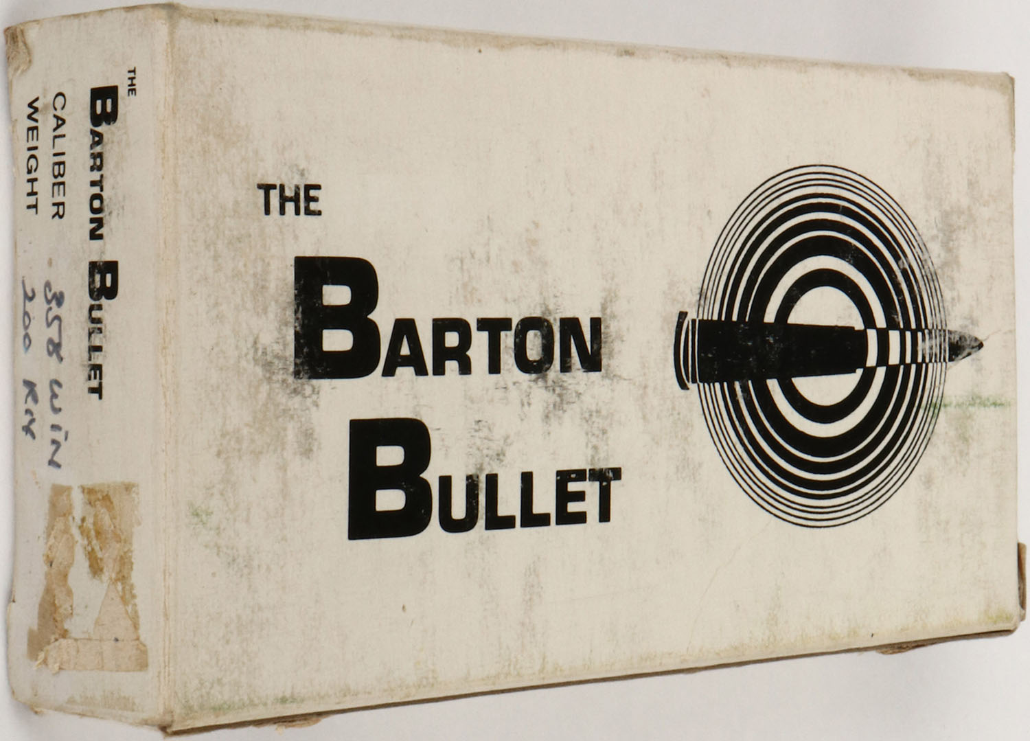 Barton Bullet, .358 Win, 1pc, Partial 19 Rds., white box with black print, box is solid with sticker mark, rub marks, light age soiling & light edge wear, ammo very good. Grade: Very Good + - Value: 20 to 60