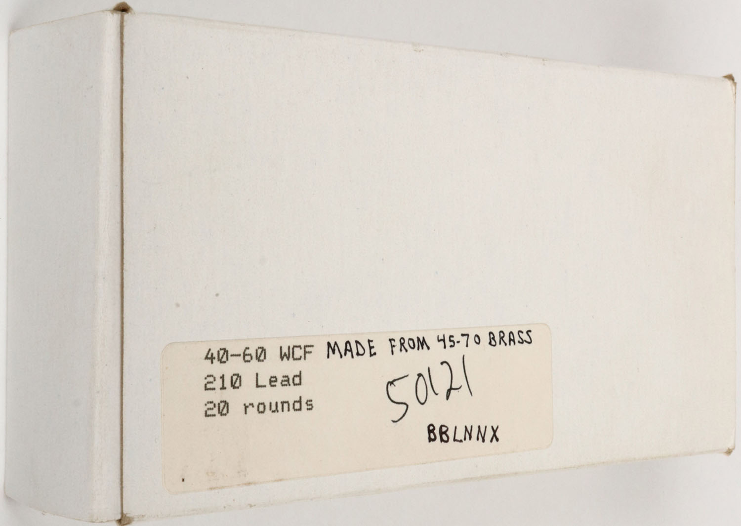 .40-60 WCF Made From 45-70 Brass, 210 Gr. Lead Bullet, 1pc, Full, white box with black print, box is solid with light rub marks, ammo is very good. Grade: Excellent - Value: 30 to 90