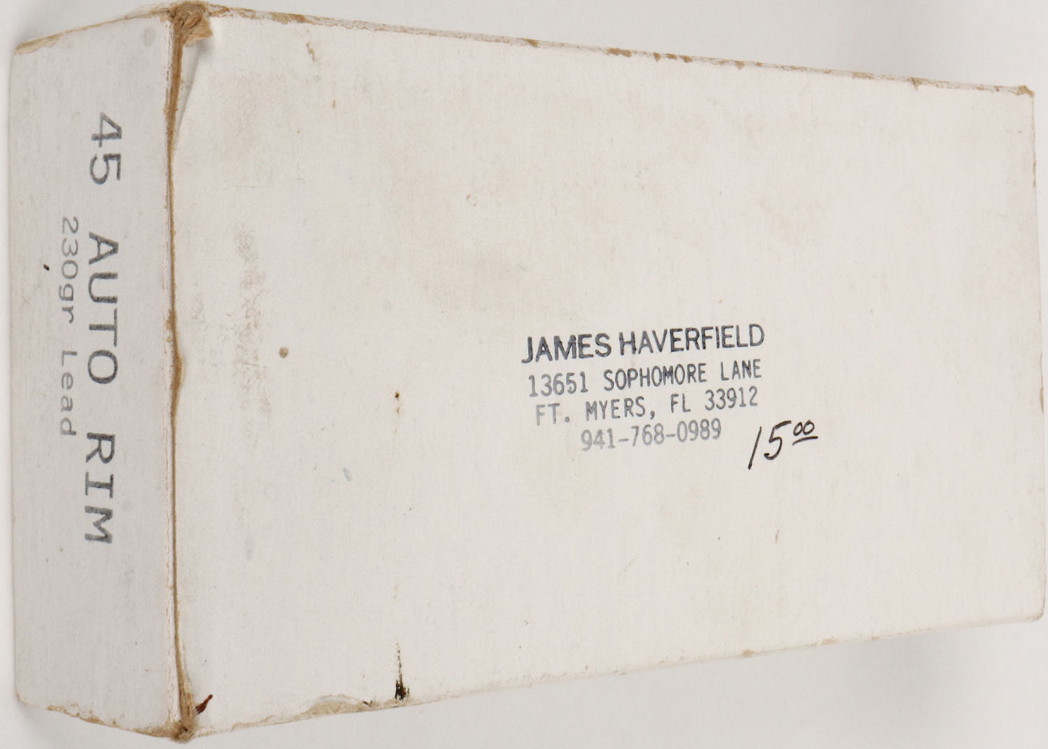 James Haverfield, 45 Auto Rim, 230 Gr. Lead Bullet, 1pc, Full, white box with black print, box is solid with rub wear & edge wear, ammo is excellent. Grade: Very Good ++ - Value: 20 to 60