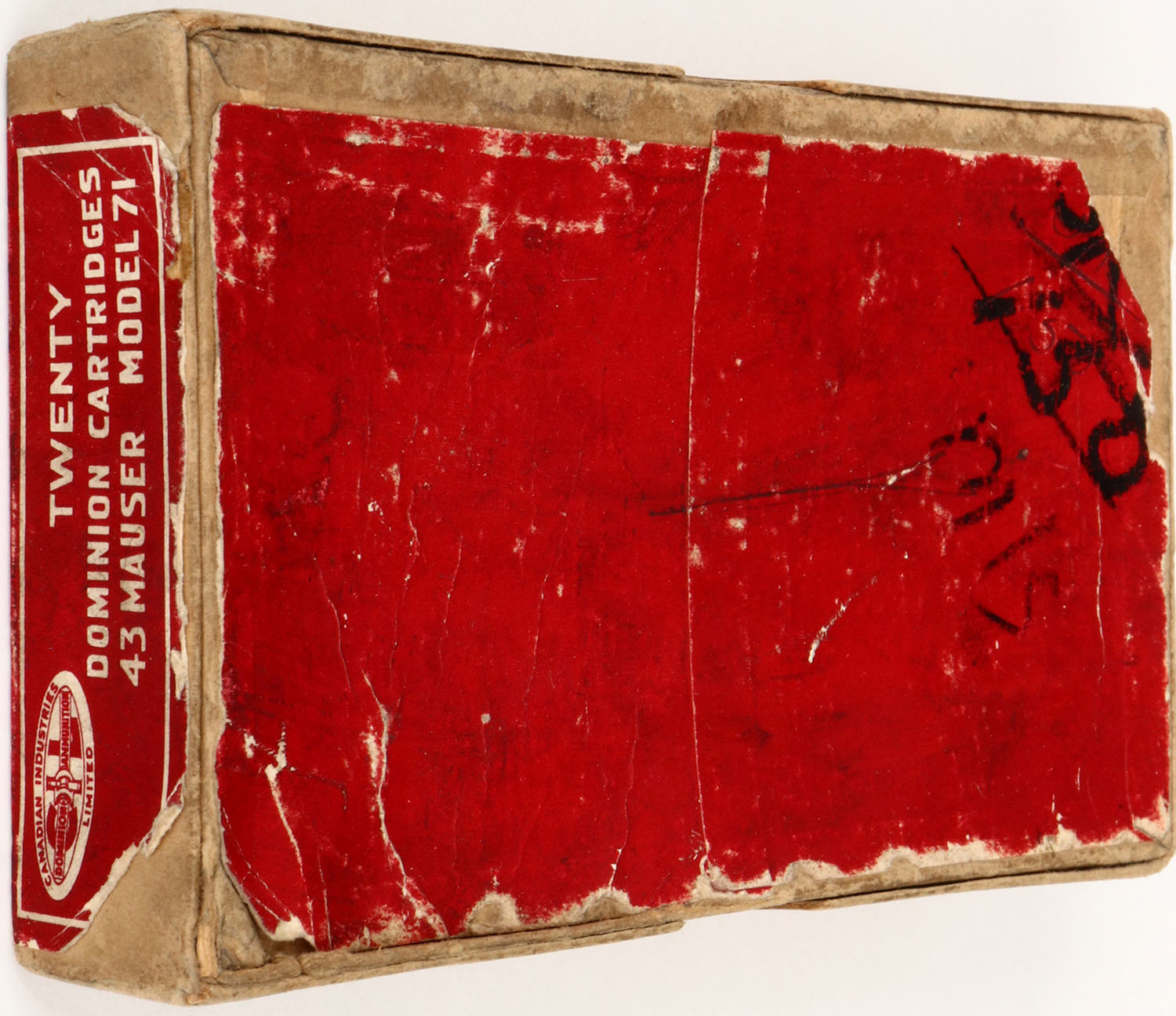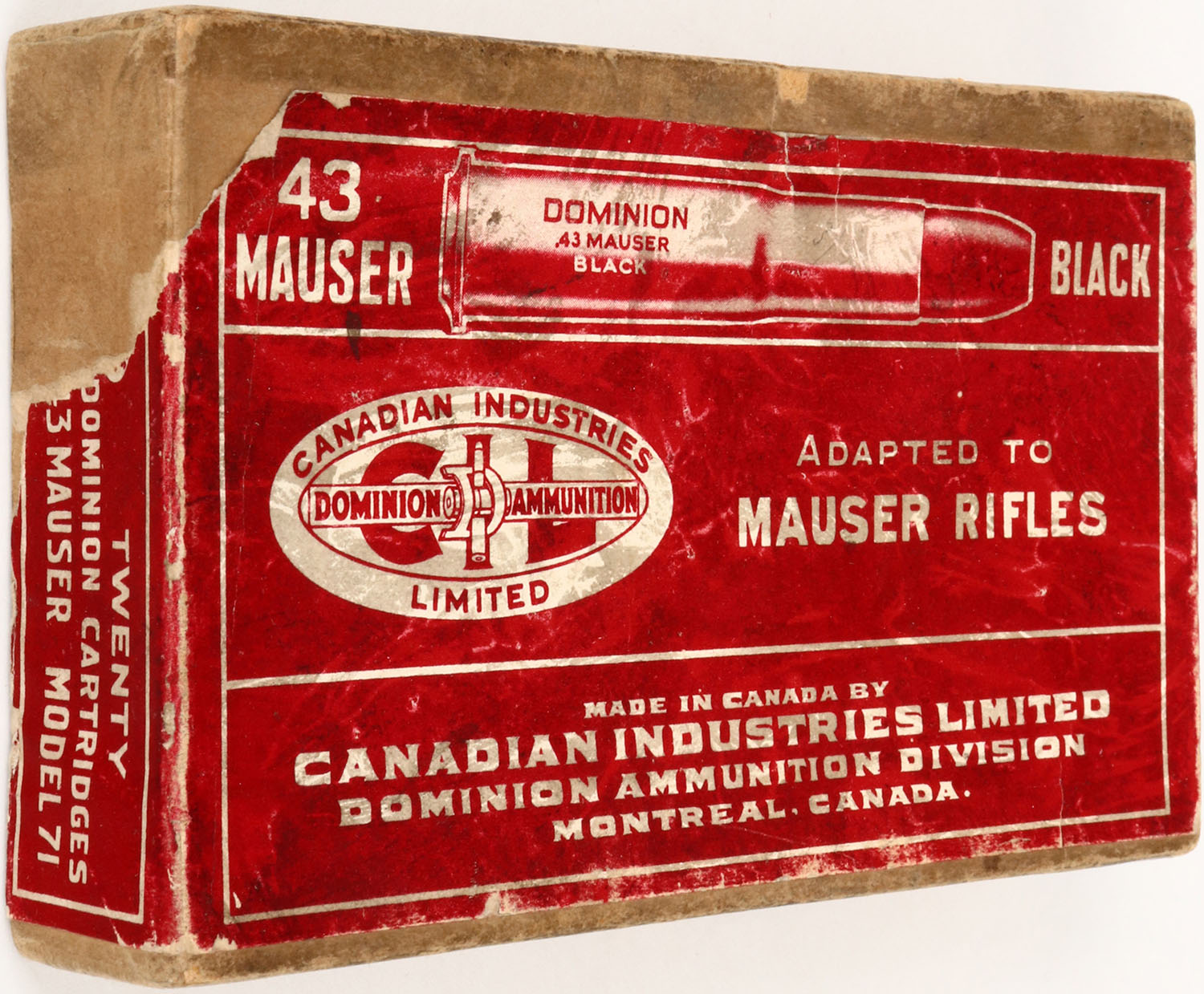 CIL, .43 Mauser, Black powder, 2pc, Empty, brown box with red label & white print, box has partial seam tear on bottom, pen marks, rub marks, edge wear & light corner wear. Grade: Very Good + - Value: 10 to 100
