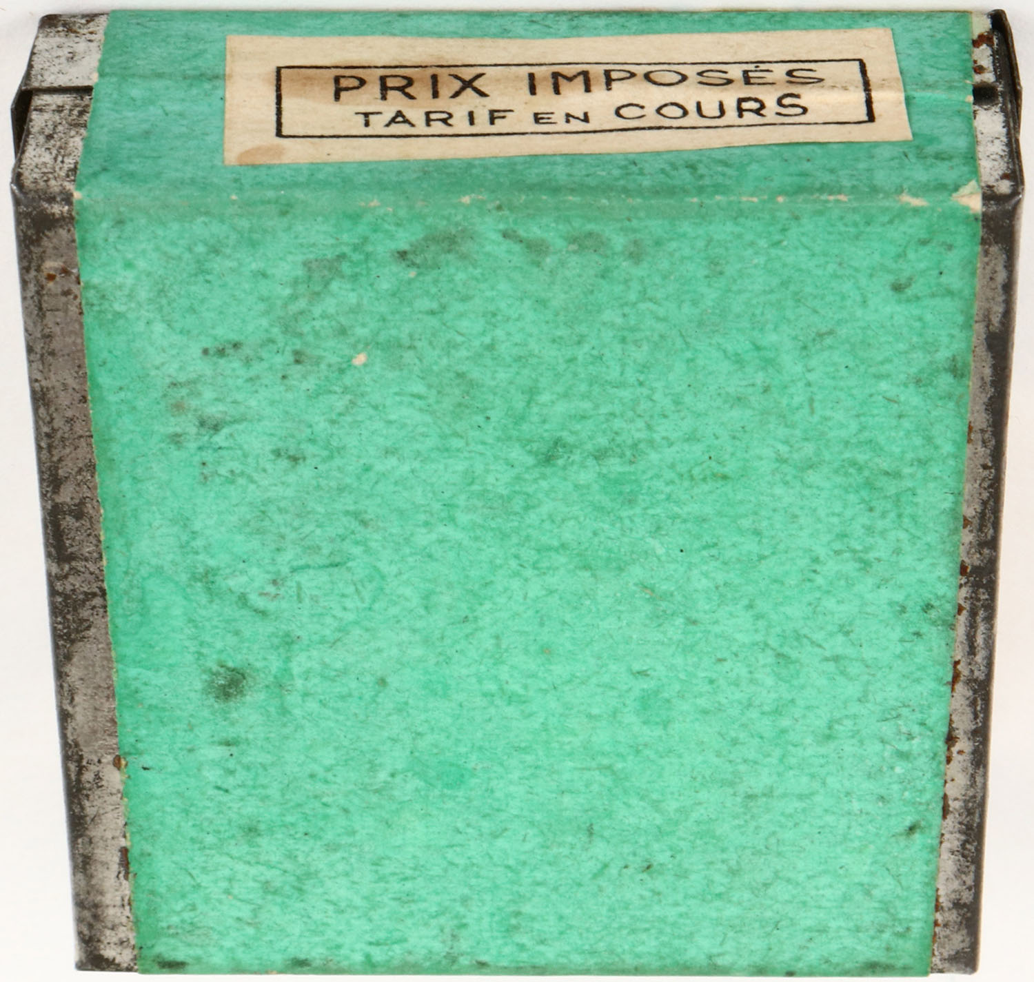 Societe Francaise Des Munitions, 7mm Pinfire Blanks, 2pc, Full, Metal box with green label & black print, box is solid with very good color, light age soiling/stains, light rub marks & light edge wear, ammo is very good. (1030) Grade: Excellent - Value: 10 to 30