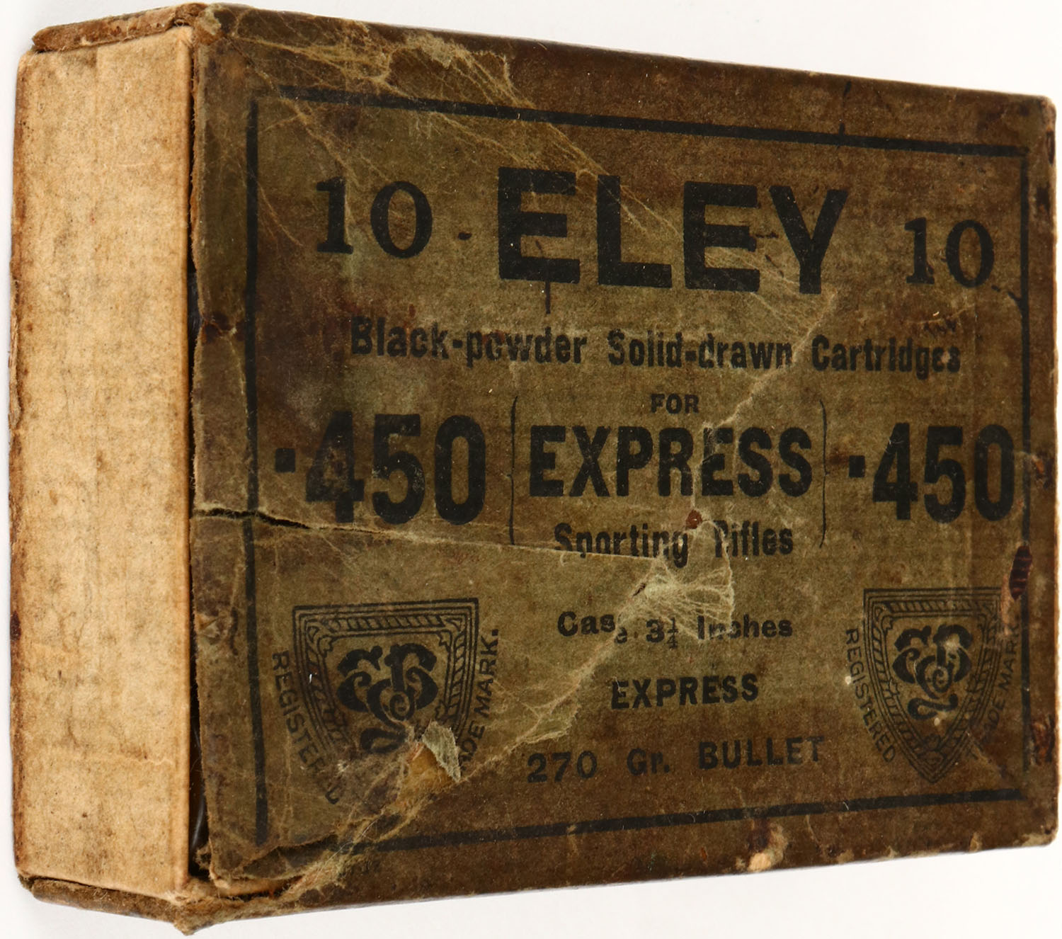 ELEY, .450 Express, Black Powder, 270 Gr. Bullet, 2pc, Full, buff box with green label & black print, box is solid with age soiling, tears in label & box, chunk of lid missing, left end flap missing, rub marks & edge wear, ammo is good. (732) Grade: Good ++ - Value: 10 to 100