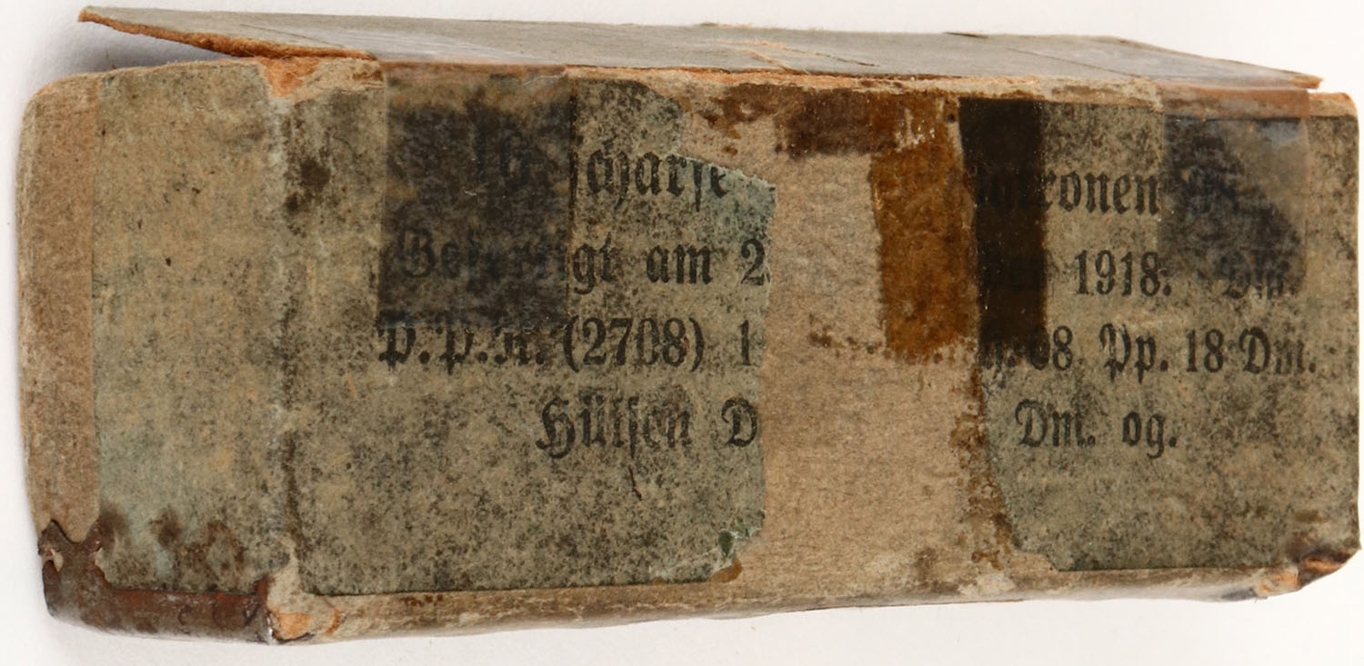 DWM, 9mm, 1pc, Full, buff box with blue label & black print, box has lid taped on, piece of label missing, light age soiling, rub marks & light edge wear, ammo is very good. (915) Grade: Very Good + - Value: 10 to 30