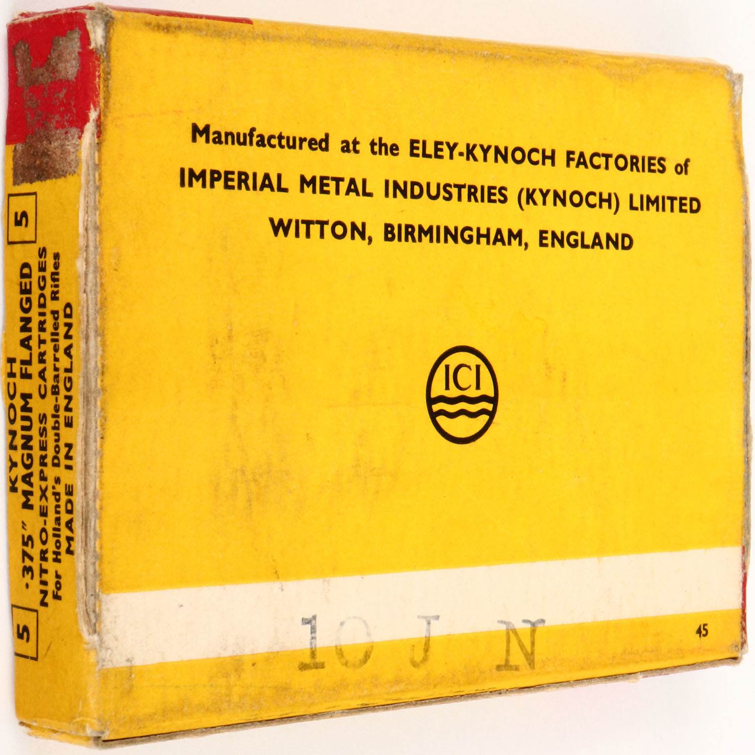 Kynoch, .375 Flanged Nitro-Express, 300 Grs. Bullet, 1pc, Full, yellow/red/white box with black print, box is solid with very good color, rub marks, light edge wear & light corner wear, ammo is very good. Grade: Excellent - Value: 30 to 120