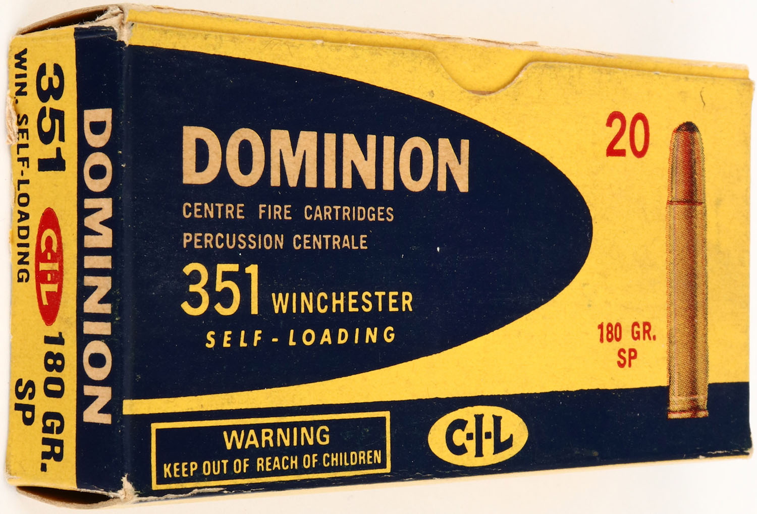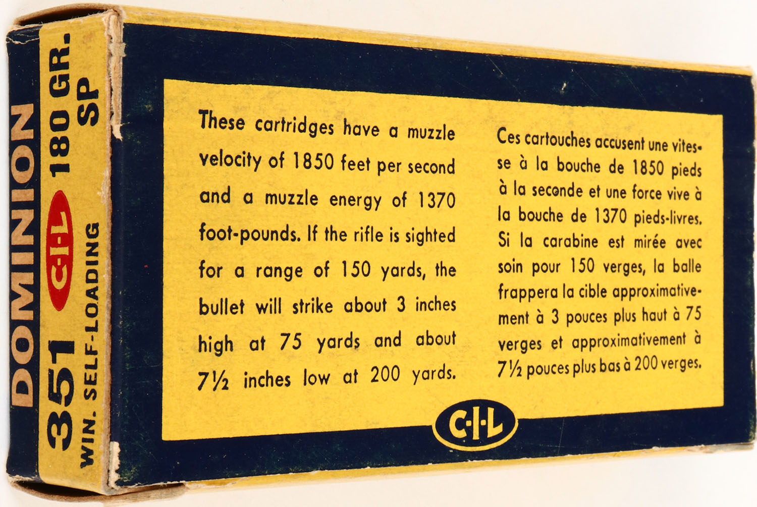 CIL, .351 Winchester Self-Loading, 180 Gr. SP, 1pc, Full, yellow box with blue label & print, box is solid with excellent color, light rub marks, light edge wear & light corner wear, ammo is very good. Grade: Excellent + - Value: 50 to 150