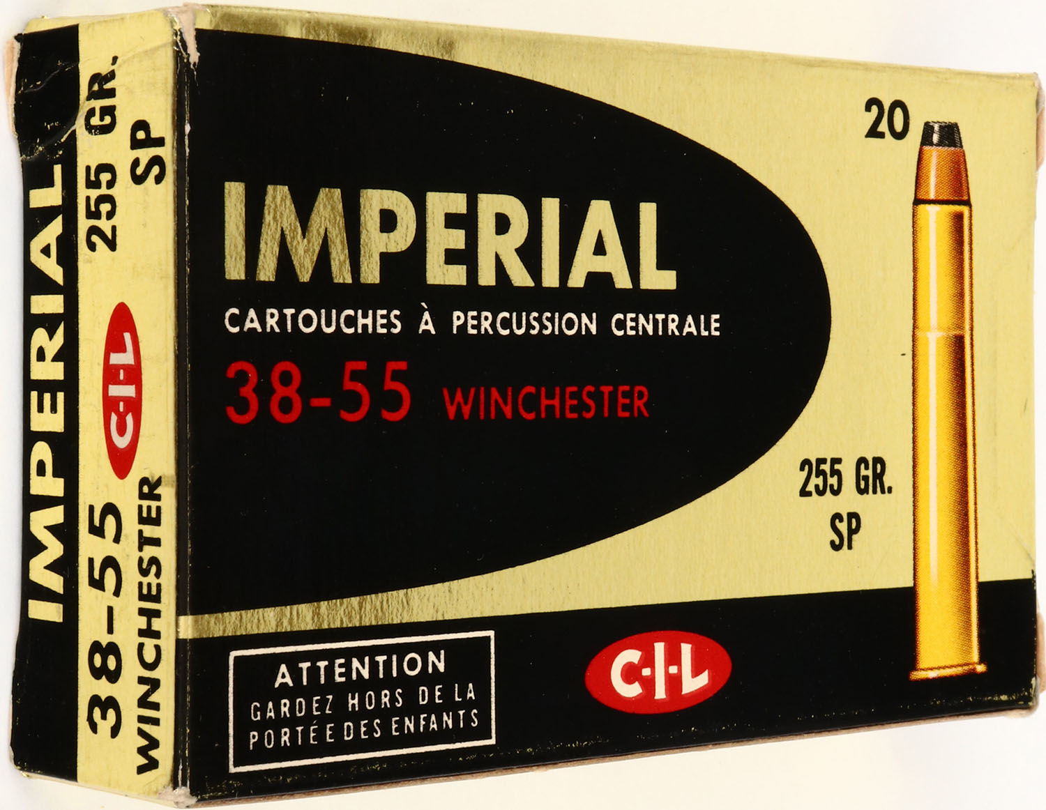 CIL, 38-55 Winchester, 255 Gr. SP Bullet, 1pc, Full, gold box with black print & white/red print, box is solid with excellent color, handling wear, light rub marks & light edge wear, ammo is excellent. Grade: Excellent - Value: 40 to 80