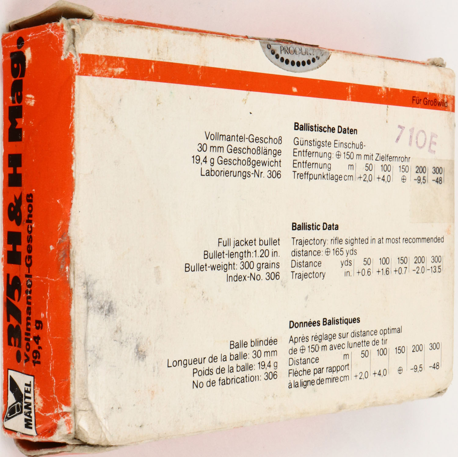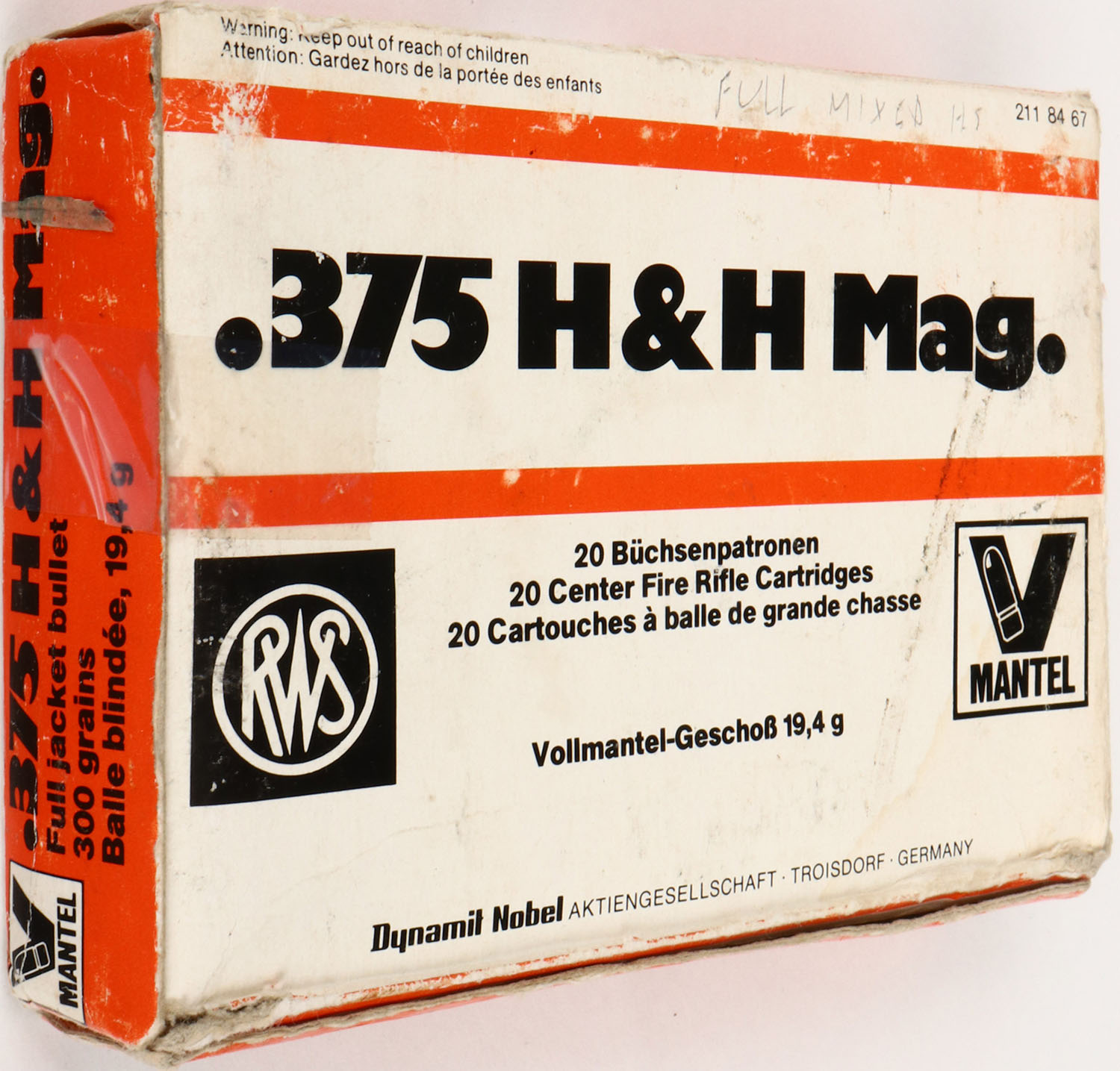 SINOXID, .375 H&H Mag., 1pc, Full with mixed bullet type, white/orange box with black print, box has split seam & tape repair, pen marks, handling wear, rub marks & edge wear, ammo is very good. Grade: Excellent + - Value: 20 to 80