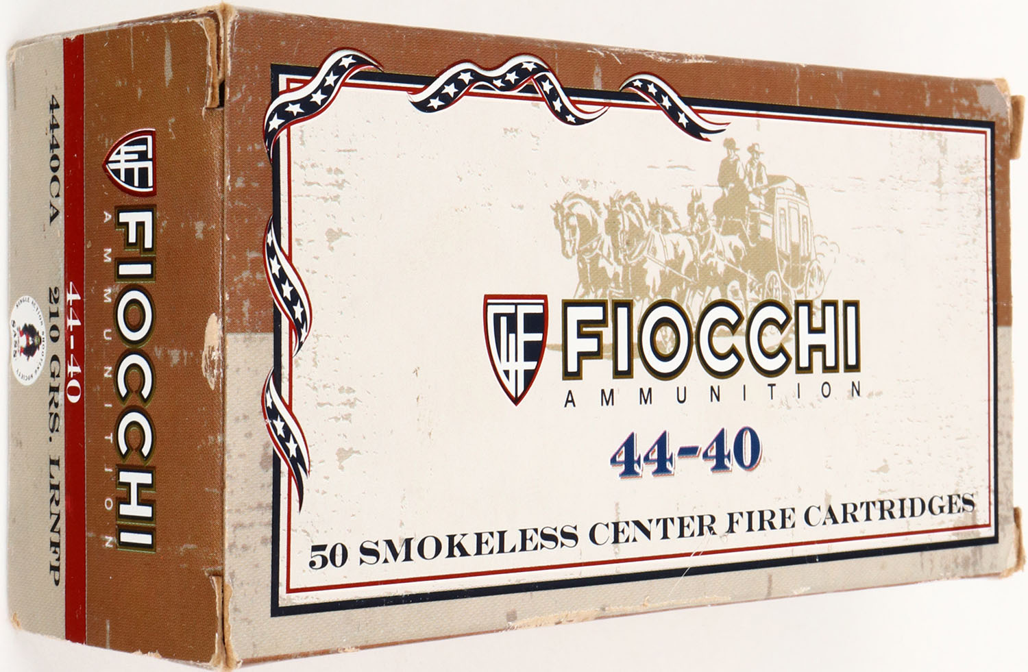 Fiocchi, .44-40, 210 Grs. LRNFP, Partial 45rds. 1pc., brown & white box, box is solid with excellent color, some shelf & corner wear, very minor edge wear, end flaps are solid, ammo is minty. Grade: Excellent ++ - Value: 40 to 120