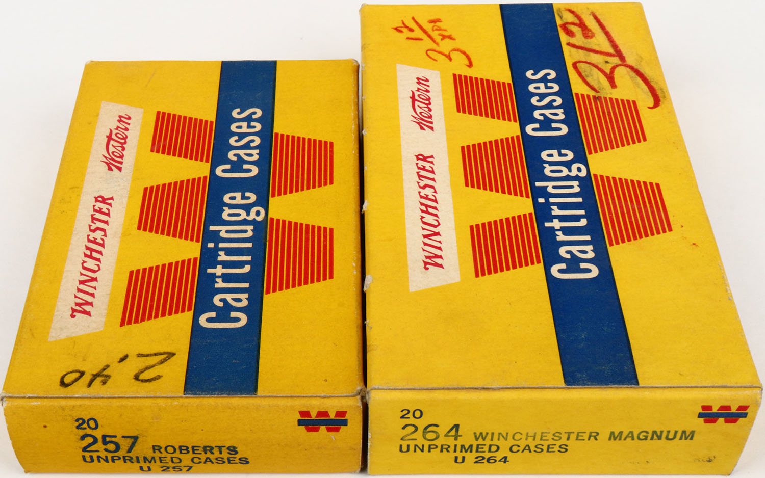 Winchester-Western, Lot of (2) Unprimed Cartridge Cases, (1) .257 Roberts, (1) .264 Winchester Magnum, Both boxes are full, both have been written on, cases are excellent. Grade: Excellent ++ - Value: 10 to 60