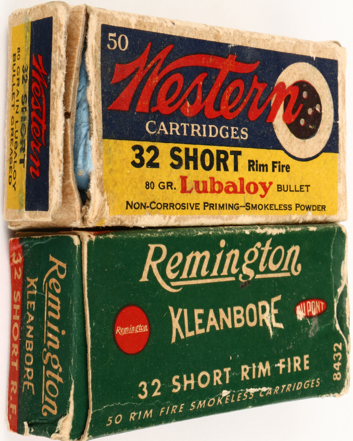 Mixed Mfg., Lot of (2) .32 Short Rim Fire boxes, both boxes partial. Grade: Excellent - Value: 6 to 60