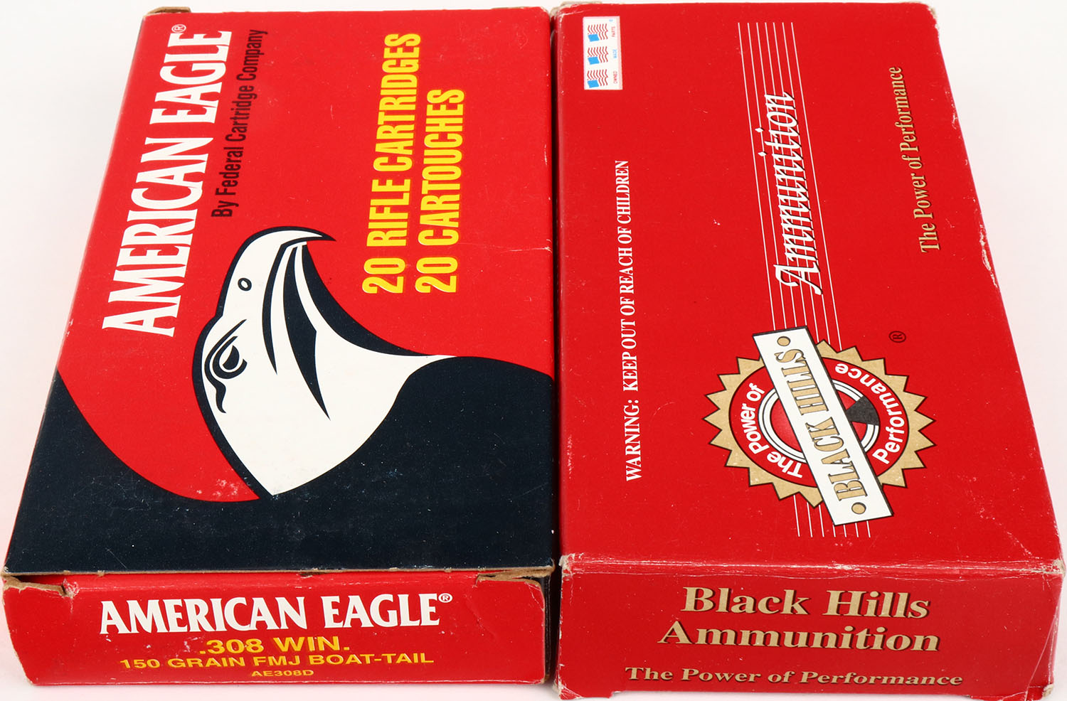 Mixed Mfg., Lot of (2) .308 Winchester Boxes, (1) American Eagle, 150 Grain FMJ Boat-Tail, (1) Black Hills 168 Gr. Boat-Tail Hollow Point, Both boxes are full, boxes are excellent with very minor wear, ammo is excellent to minty. Grade: Excellent ++ - Value: 40 to 120