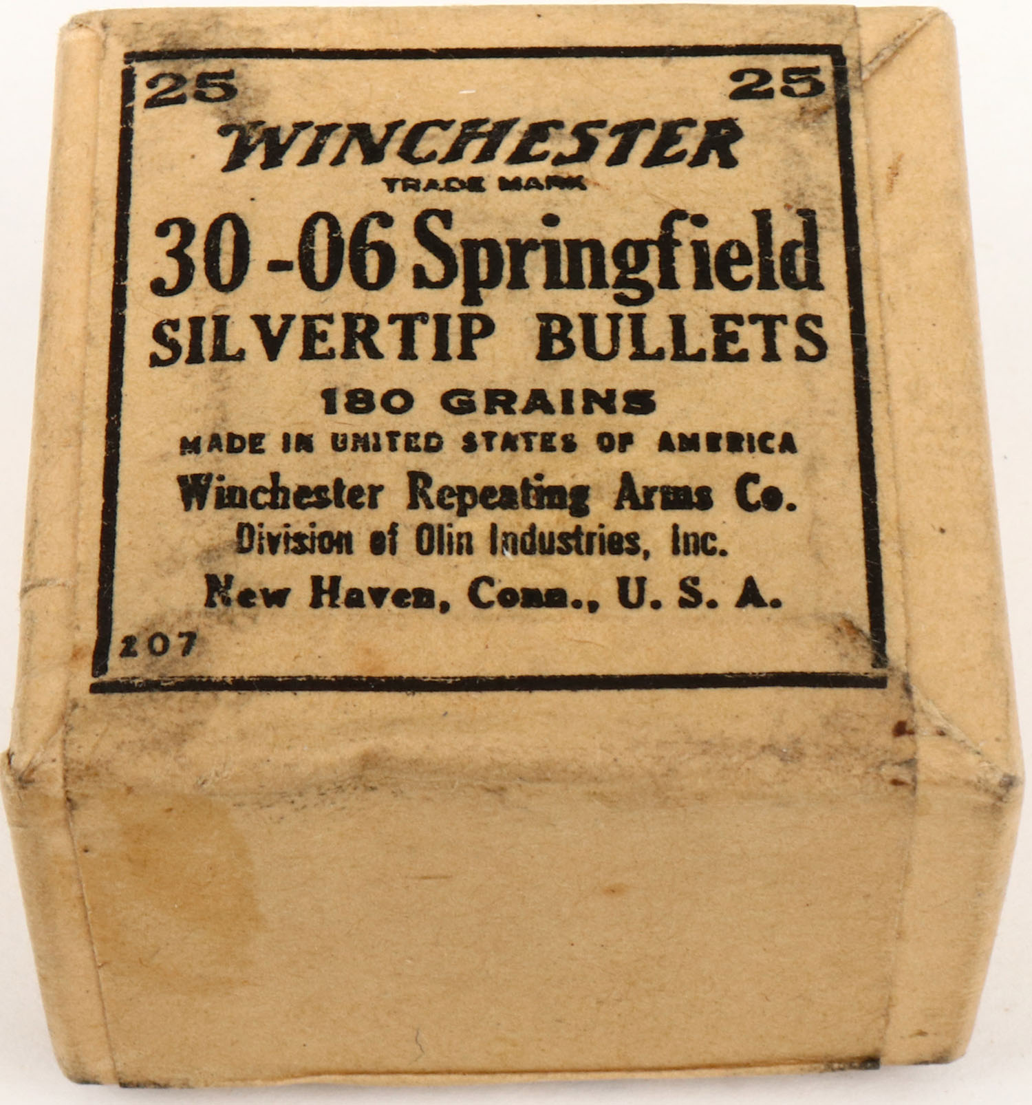 Winchester, .30-06 Springfield, Silvertip Bullets, 180 Grains, FULL & SEALED, box is solid with excellent to minty color, very minor age soiling, corners are sharp, edges are crisp, labels are intact. Grade: Excellent ++ - Value: 40 to 80