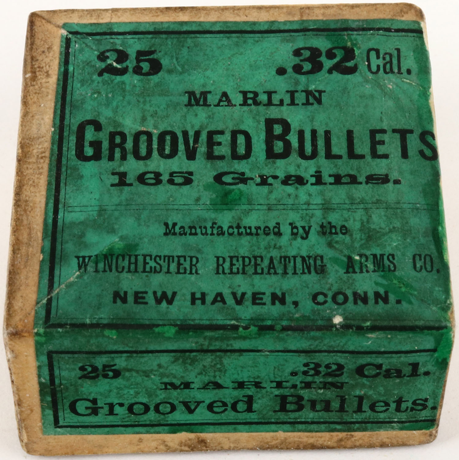 Winchester, Marlin, Grooved Bullets, .32 Cal., 165 Grains, Full, 2pc. Buff box with green label, box is solid with excellent color, age soiling, corners are mostly sharp, edges are crisp, label is intact, bottom has been written on, bullets are very good. Grade: Excellent + - Value: 10 to 50