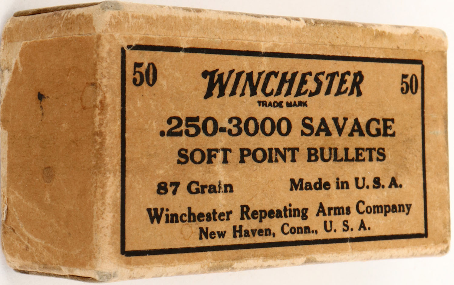 Winchester, .250-3000 Savage, 87 Grain Soft Point Bullets, Full, 2pc. Buff box with buff & black label, box is solid with excellent color, minor edge & corner wear, label is intact, bullets are excellent. Grade: Excellent ++ - Value: 10 to 50