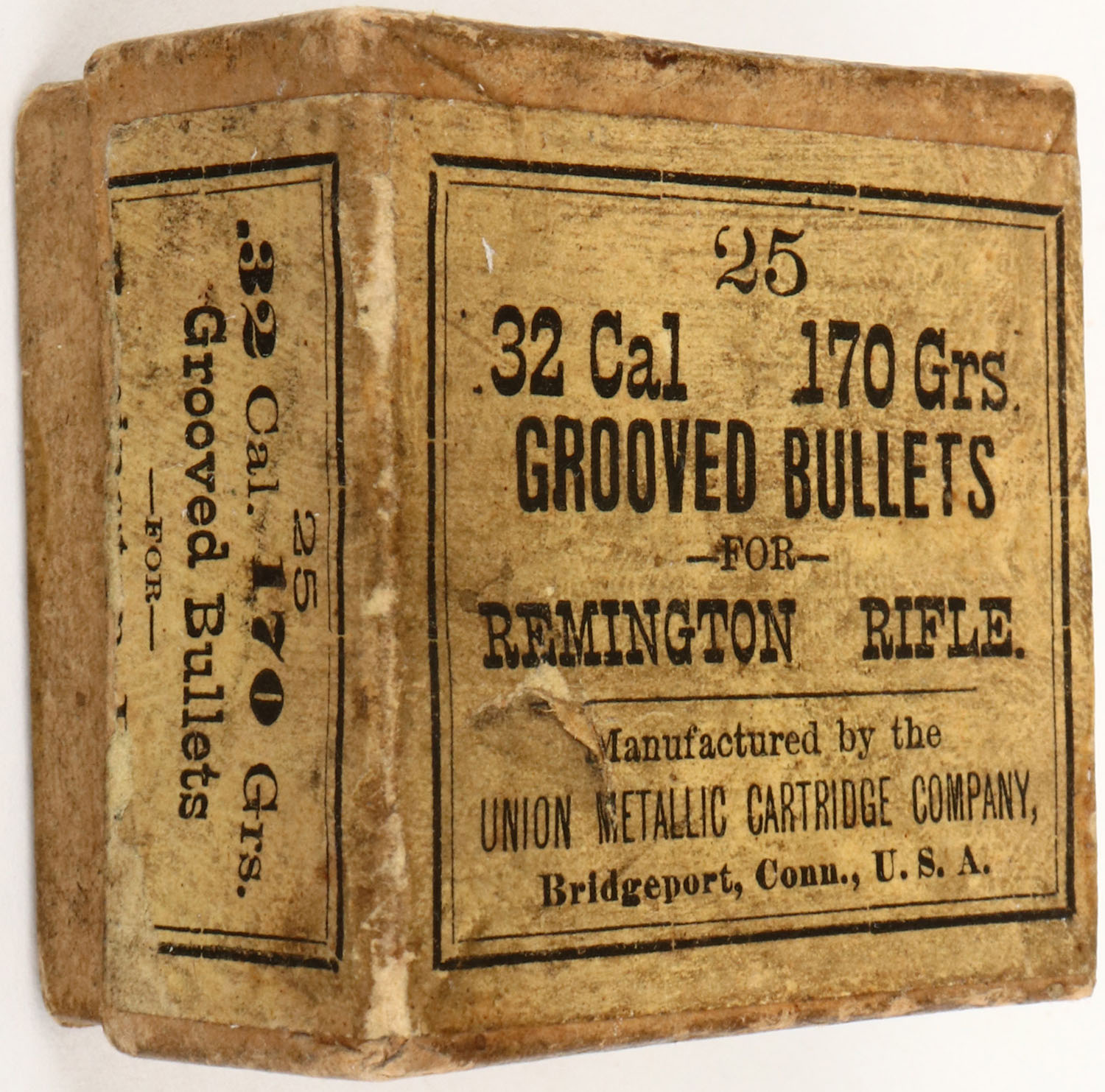 UMC, .32 Cal., 170 Grs. Grooved Bullets, Partial 14rds. 2pc buff box with buff labels, box is solid with very good color, age soiling, minor edge & corner wear, labels are intact, bullets are excellent. Grade: Excellent + - Value: 2 to 40