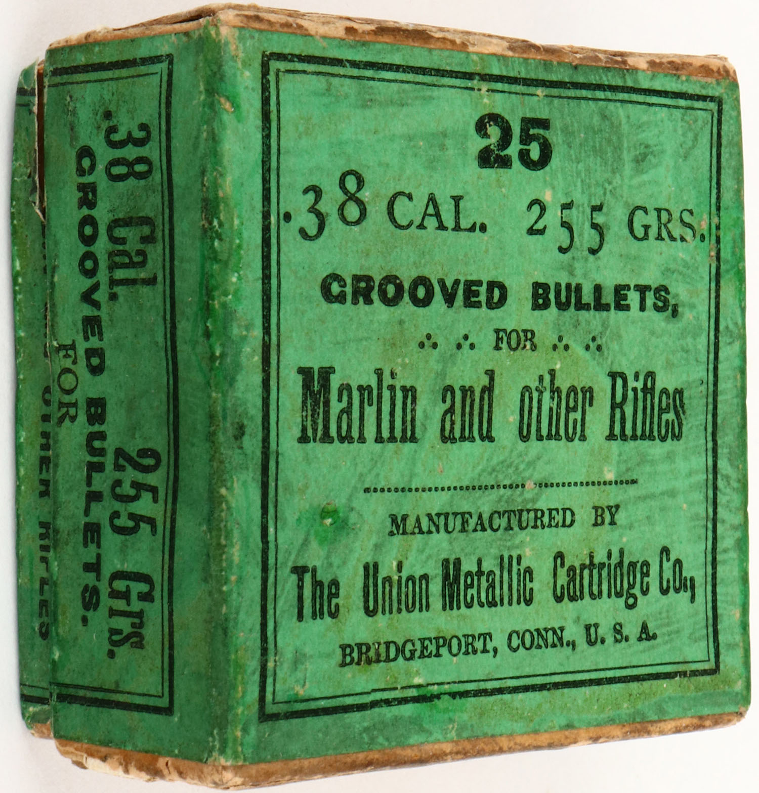 UMC, .38 Cal., 255 Grs. Grooved Bullets, Partial 14rds., 2pc. Buff box with green labels, box is solid with excellent color, age soiling, minor edge & corner wear, labels are intact, bullets are excellent. Grade: Excellent + - Value: 2 to 40
