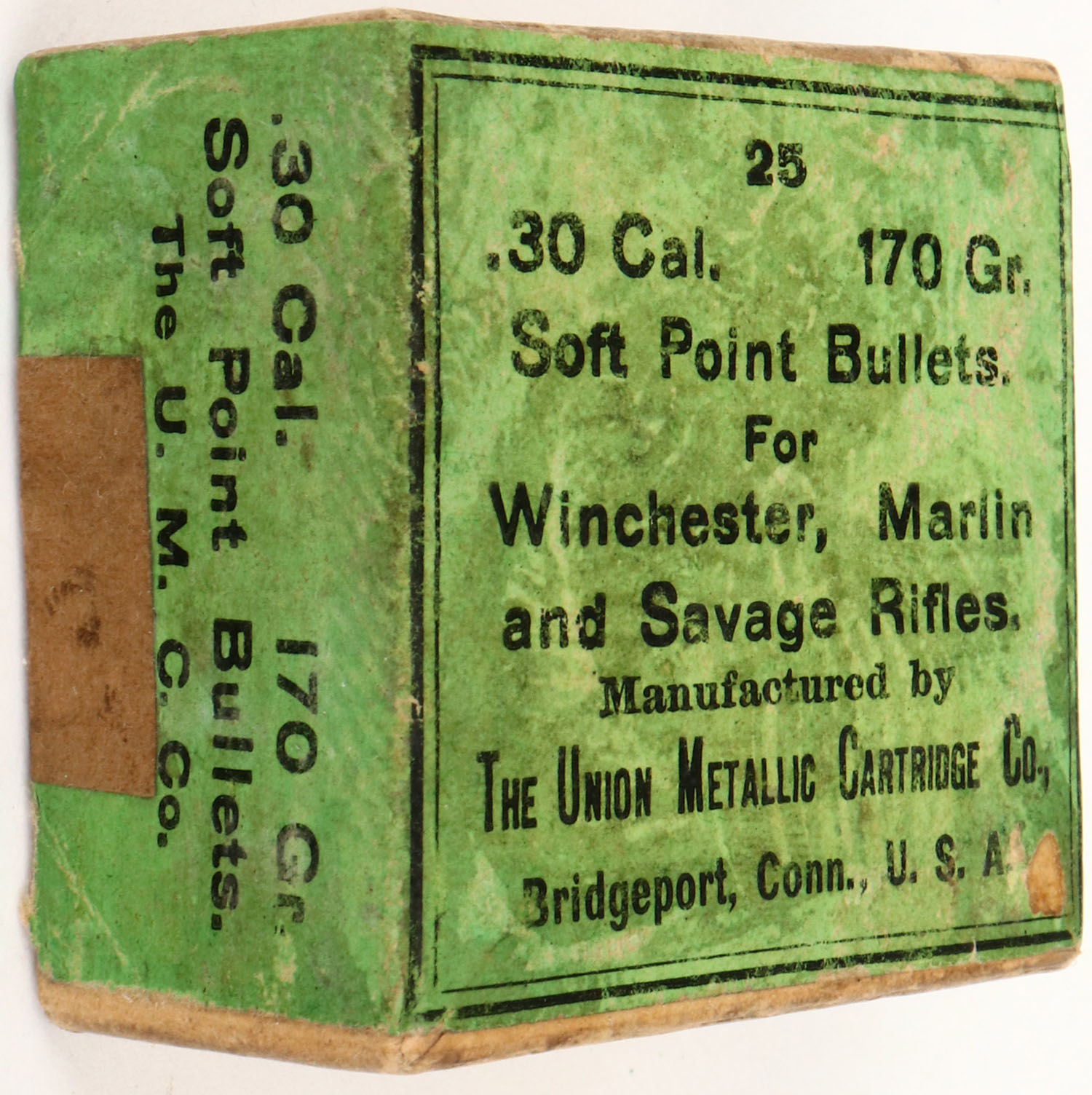 UMC, .30 Cal., 170 Gr. Soft Point Bullets, Full, 2pc. Buff box with green label, box is solid with excellent color, minor age soiling, very minor edge & corner wear, label is intact, bullets are excellent. Grade: Excellent + - Value: 10 to 50