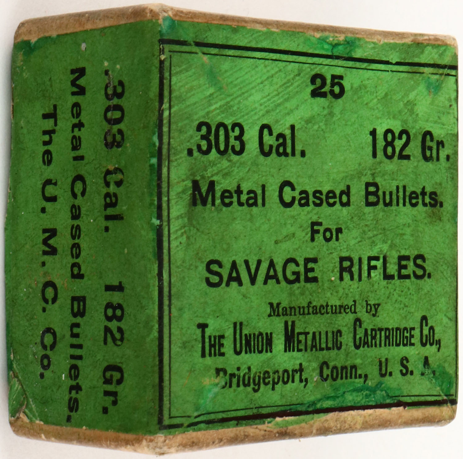 UMC, .303 Savage, 182 Gr. Metal Cased Bullets, FULL & SEALED, 2pc. Buff box with green wraparound label, box is solid with excellent color, some age soiling, very minor edge & corner wear, label is intact. Grade: Excellent + - Value: 20 to 80