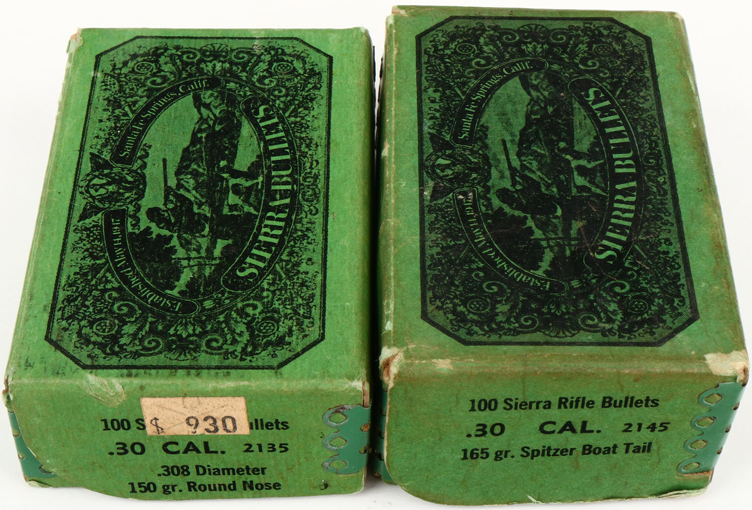 Sierra Bullets, Lot of (2) .30 Cal. Bullet boxes - (1) 165 Gr. Spitzer Boat tail, Partial 60rds., (1) 150 Gr. Round Nose, Partial 81rds., Both boxes are solid with excellent color, all ammo is minty. Grade: Excellent ++ - Value: 10 to 100