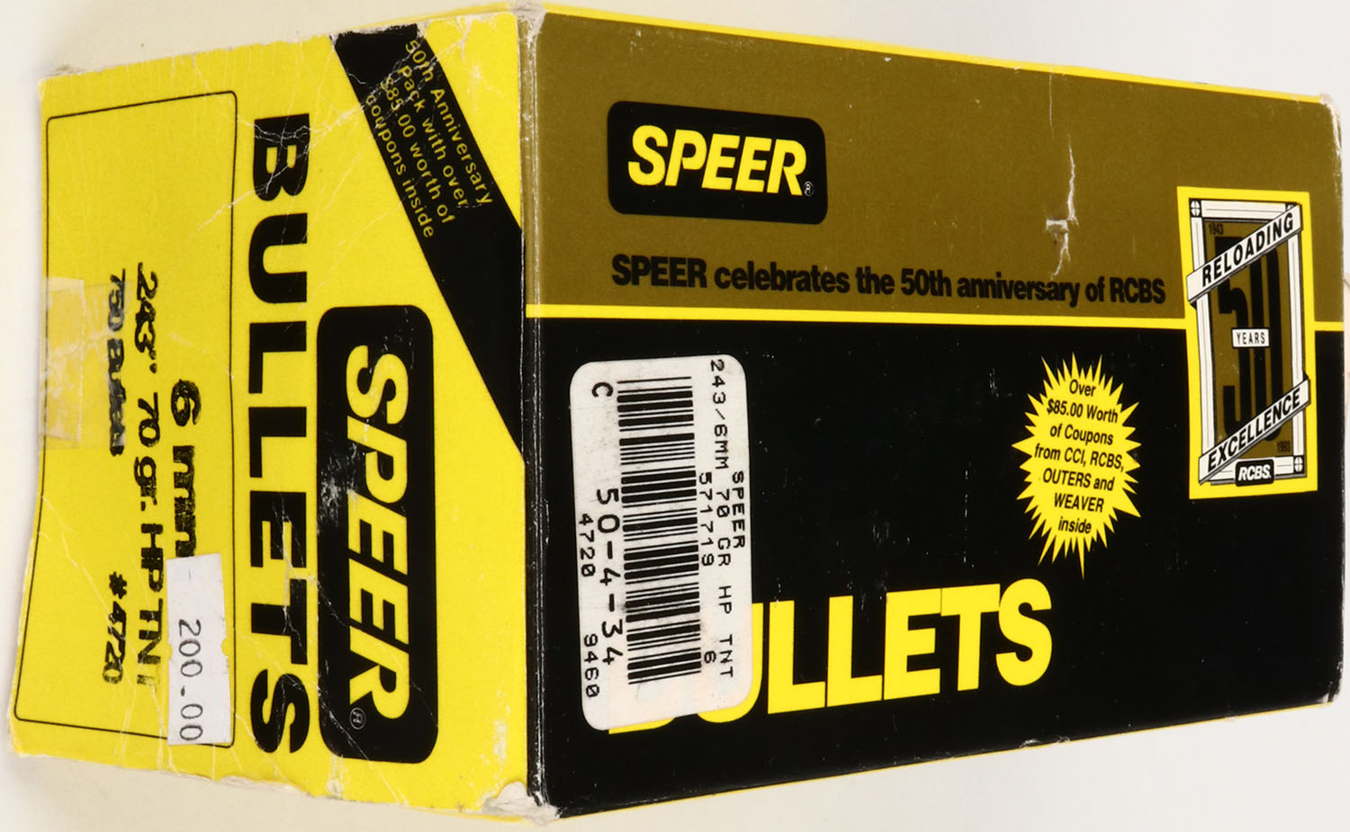 Speer Bullets, 6mm (.243'') 70 Gr. HP TNT, Full, 750rds., 1pc. Yellow & black box with green plastic ammo can inside, box is solid with minty color & some wear, plastic ammo can is mint, bullets are mint. Grade: Excellent ++ - Value: 100 to 400