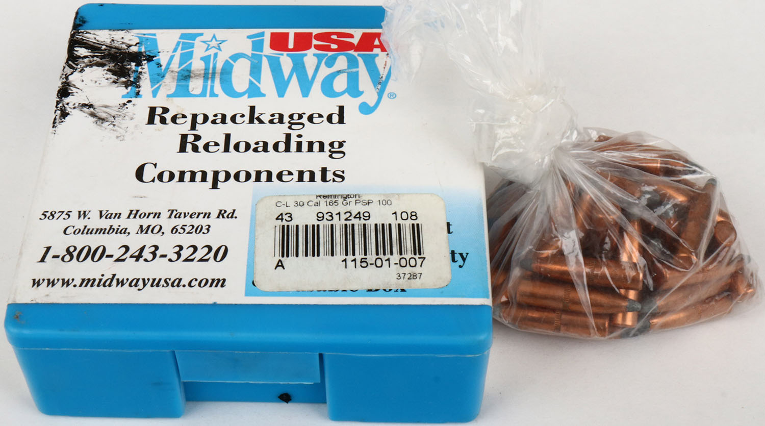 Mixed Mfg. Lot of bullets, (1) FULL & SEALED Box of Midway USA .30 Cal. 165 Gr. PSP Bullets, (1) 50rds. bag of loose round of unknown Grain Soft Point bullets measure .241'' on micrometer, ammo is excellent. Grade: Excellent + - Value: 10 to 100