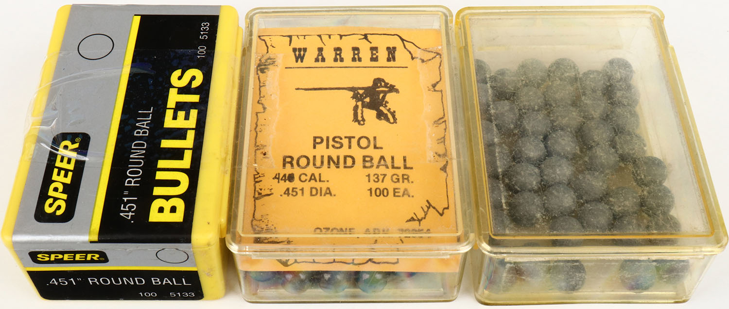Mixed Mfg., Lot of (3) boxes of .451 Round Ball, (1) Partial unlabeled, (1) Warren 137 Gr., Full, (1) Speer, Full, lead in all boxes is excellent. Grade: Excellent - Value: 6 to 60