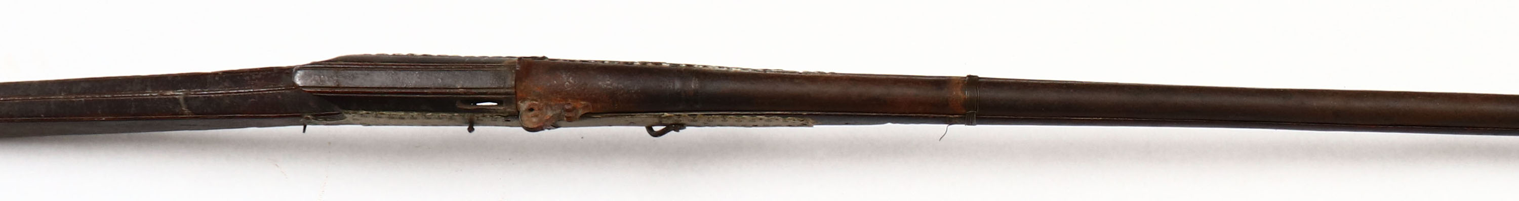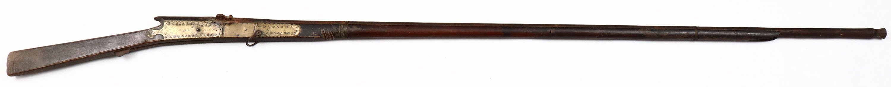 Indian, Toradar, CAL: .65, MFG: 1800's, S/N: N/A, Matchlock Muzzleloader, 60'' round barrel. The wood stock is good with brass plates on left & right side. The wood has contusions, scrapes, nicks & dings. The brass plates have engraved decorations. The barrel has toned to a brown patina, with a faint flower engraving on barrel by lock. Bore is poor with rust & pitting. The barrel holds a bead front sight & fixed aperture rear sight. Wire barrel bands. One rear sling mount, missing arm on matchlock. The Toradar is a South Asian designed matchlock that was copied by Indian armorers around the 15th century and soon after a distinctive local style would emerge which everyone would copy, it was the preferred firearm in India by many until the mid 1800s because of its simple & cheap design. Muzzleloader, No FFL Req. - Value: 200 to 1000