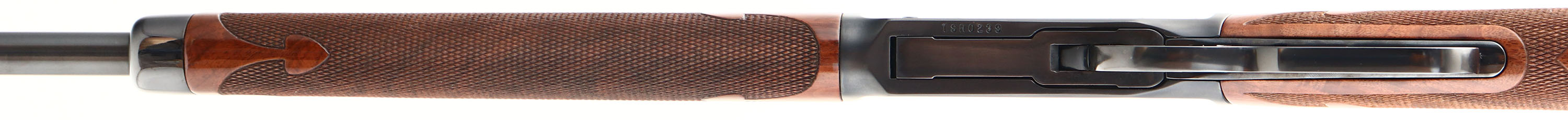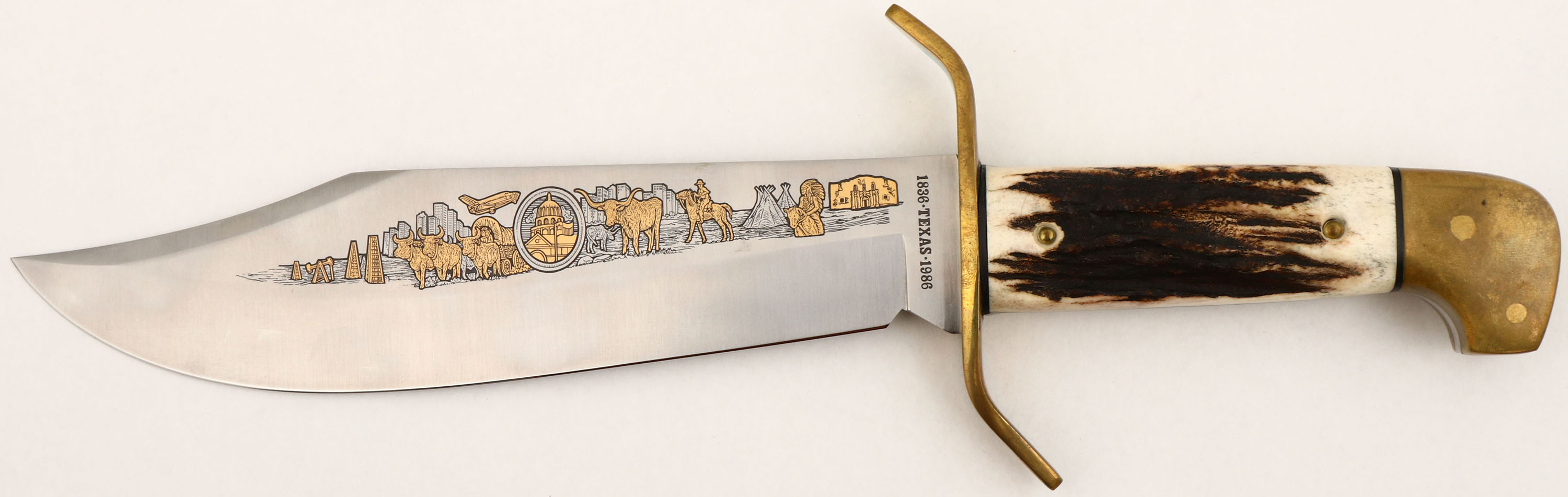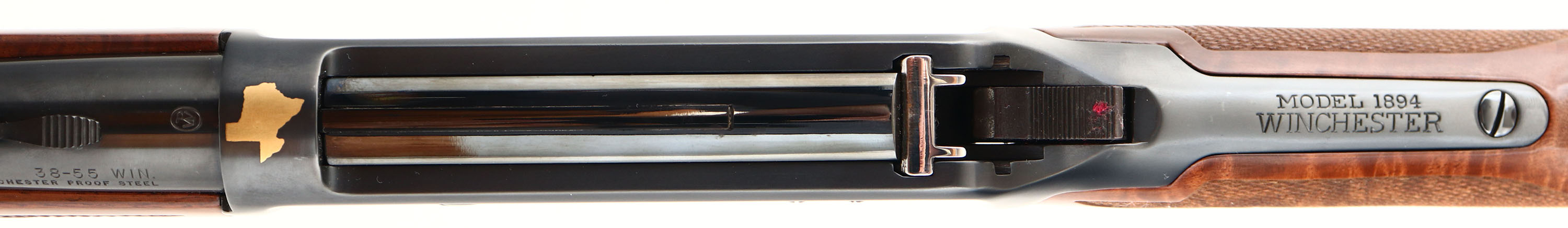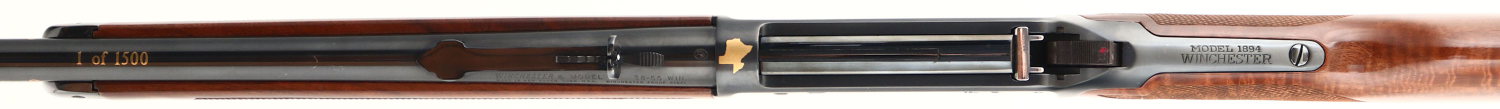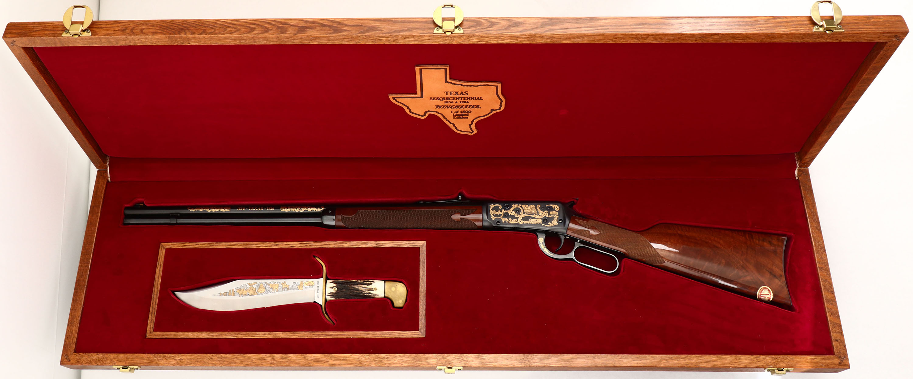 OUTSTANDING Winchester Model 94 Texas Sesquicentennial Rifle & Bowie Knife Cased Set , marked .38-55 WIN Cal., MFG. 1986, SN: TSR0239, Lever Action Rifle, 24'' Round barrel, Full mag. This is a fantastic Winchester collectible set celebrating the 150 yr anniversary, 1836-1986, of Texas being a state. Limited Edition, 1 of 1500. The original deluxe & checkered wood stocks are excellent, displaying fantastic grain. The high gloss original finish is also excellent, with virtually no handling marks. The original factory high luster blue finish rates 100%. The receiver, barrel & lever all carry wonderful gold embellishments. Bore is mint. Barrel fitted with the original front & rear sights. Crescent metal buttplate. Comes with a 14.5'' Bowie Knife, which is fitted with wonderful stag grips & also carries similar Winchester, Western, & Texas themed gold embellishments on each side of the blade. Rifle & knife come stored in the original hardwood display case. Case is fantastic both in quality & condition. This is a very fine collectible set. FFL Req. - Value: 2000 to 4000