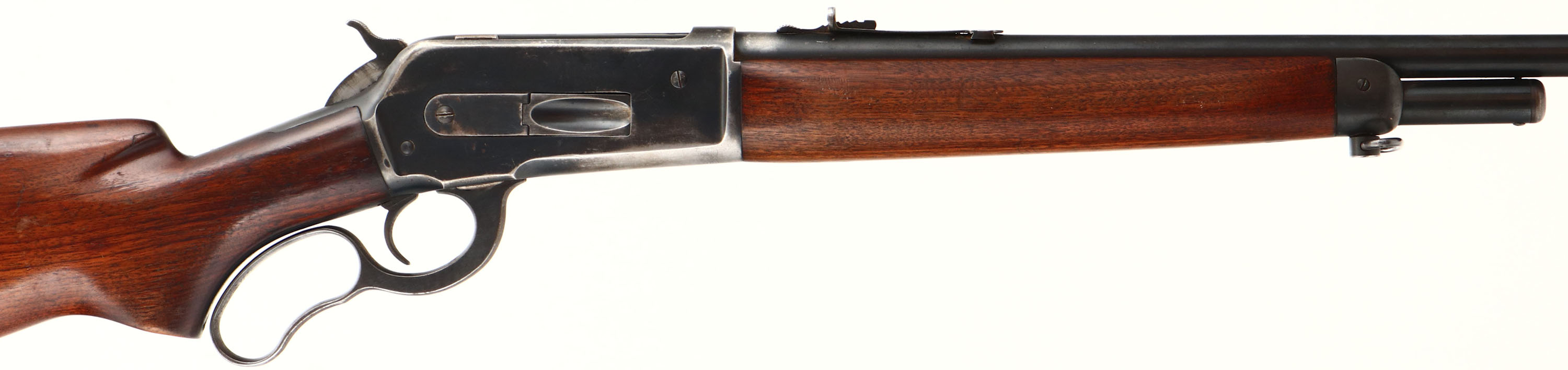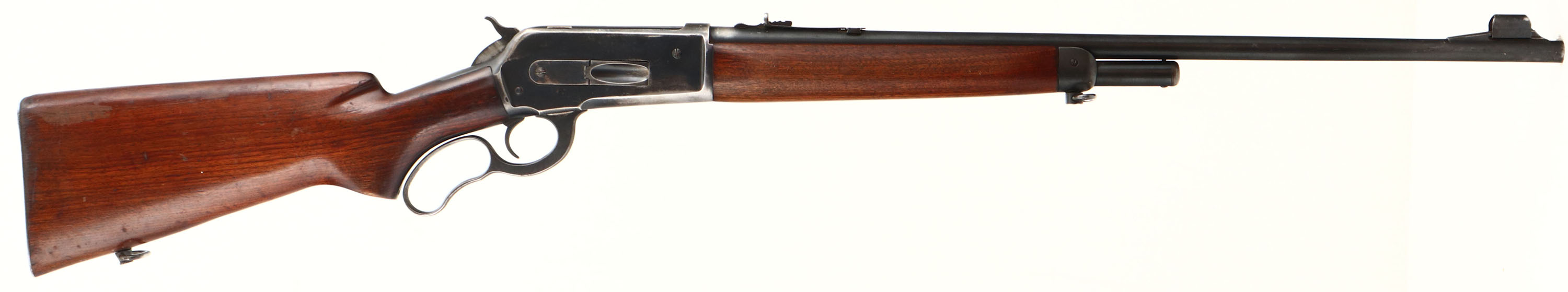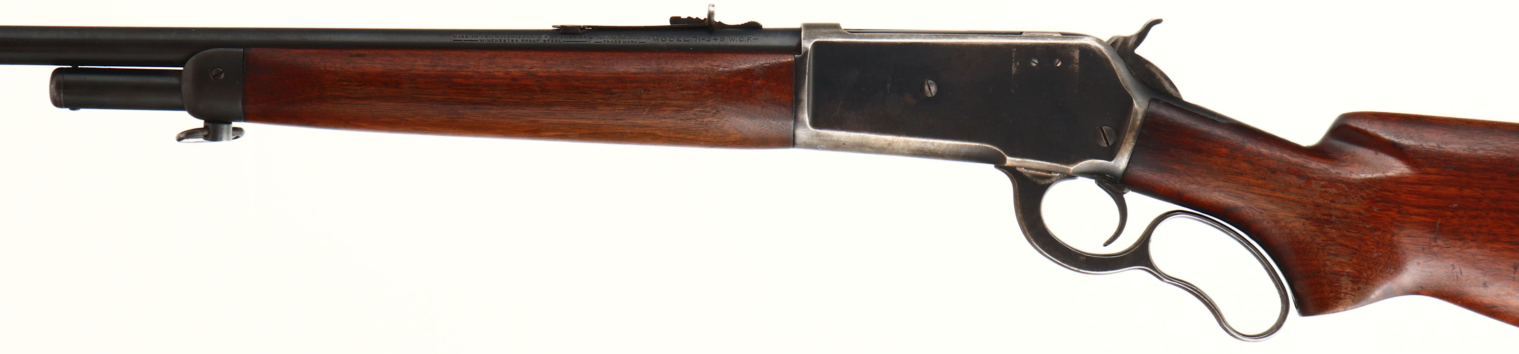 Winchester, Model 71, CAL: 348 W.C.F., MFG: 1948, SN: 27300, Lever Action Rifle, 24'' Round barrel, Short Tang, 1/2 Mag. The original flat pistol grip wood stocks are very good, with thinning wear & scrapes to the original finish. There are other scratches, scrapes & contusions. The factory metal blue finish is 85% on barrel, 70% on receiver, with most loss worn to metal gray on the belly & 90% on tube. The barrel holds the correct adjustable rear sight & ramped elevated hooded blade front sight. Bore is excellent & bright, with sharp rifling. The left side of the receiver is factory drilled & tapped for a receiver sight, with two filled screws. Stock carries the factory checkered metal buttplate. Sling swivels present. FFL or C&R Req. - Value: 1000 to 2000