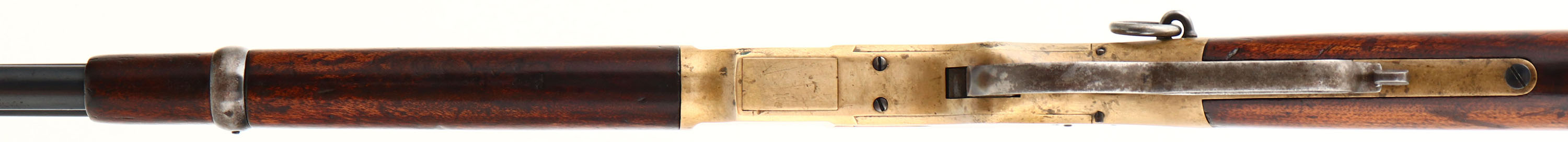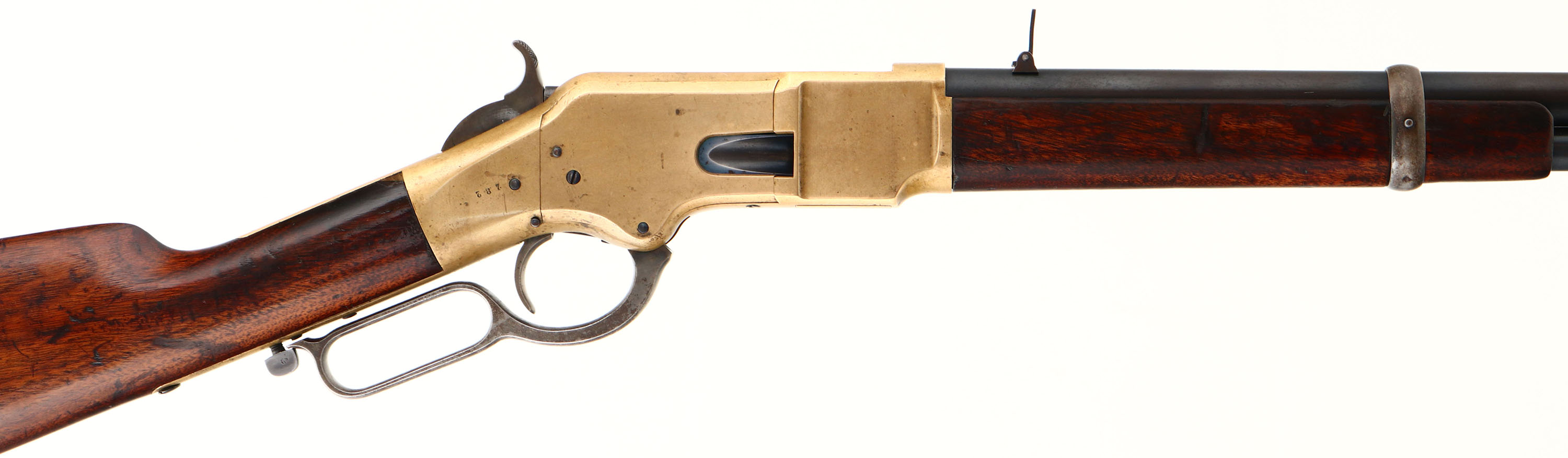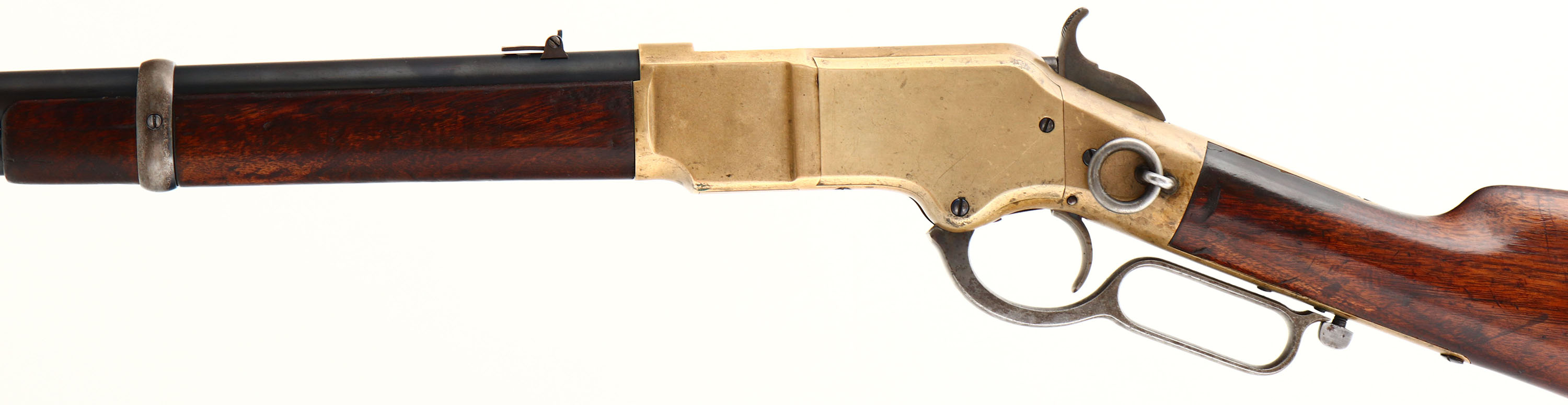 Winchester, Model 1866 Saddle Ring Carbine, 2nd variation, .44 Henry Cal., MFG. 1869, SN: 21808, Lever Action Rifle, 20'' Round barrel, Full mag. Rare early carbine with a Henry marked barrel. The address atop the barrel is still very sharp. The original wood stocks are excellent & solid. The stocks original finish has thinned & darkened from use & oils, with some added oils or protective finish. Stock has a repaired chip in the upper left corner of the tang & a small missing chip at the right corner. There are handling marks, scrapes & small contusions. The barrel & mag display 85% coverage of what appears to be the original metal blue finish, with some added finish in areas of previous wear or light pitting. The blue is starting to tone to a brown patina in areas of thinning. The lever & hammer retain muted remains of case-colors. The brass receiver & buttplate have a nicely aged patina. Bore is excellent. The barrel carries the original flip-up rear sight, with 1,3 & 5 markings for 100, 300 & 500 YDS & a standard pinch blade barrel band front sight. Stock carries a brass trapdoor crescent buttplate. A staple mounted saddle ring is located on the left side of the receiver. The numbers ''282'' are stamped on the rear portion of the right side of receiver. The SN is stamped on the lower tang. Tight, smooth action & appears mechanically sound. This early 1866 SRC has a wonderful aged appearance & these rifles are hard to find in this well maintained condition.* Antique, No FFL Req. - Value: 15000 to 18000