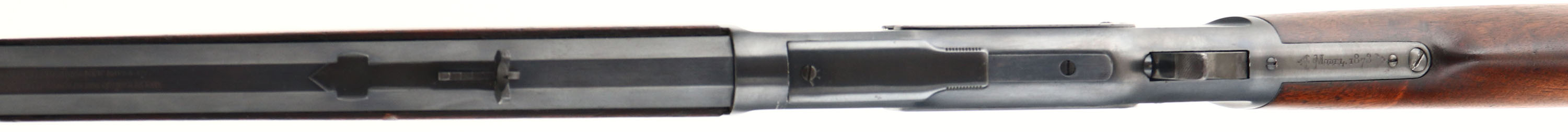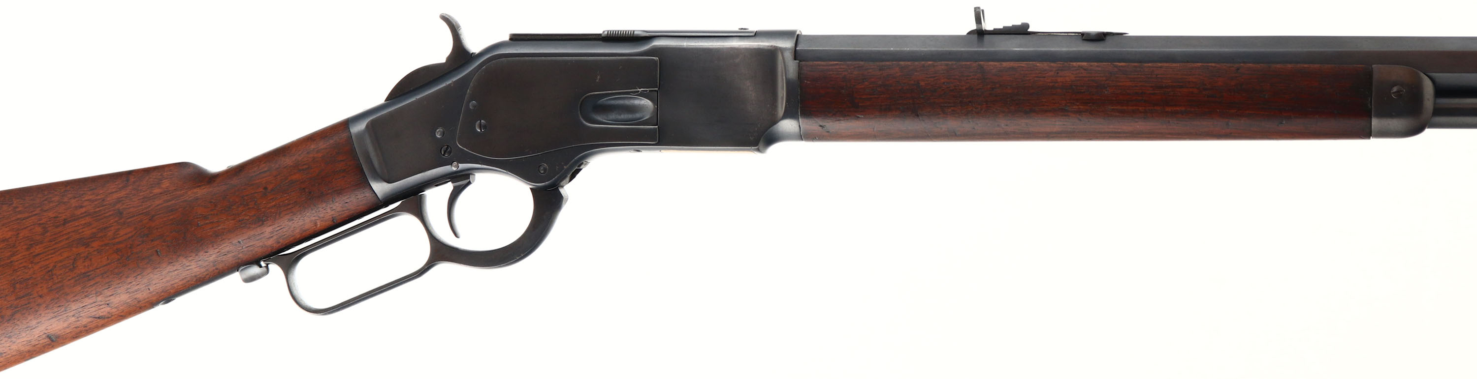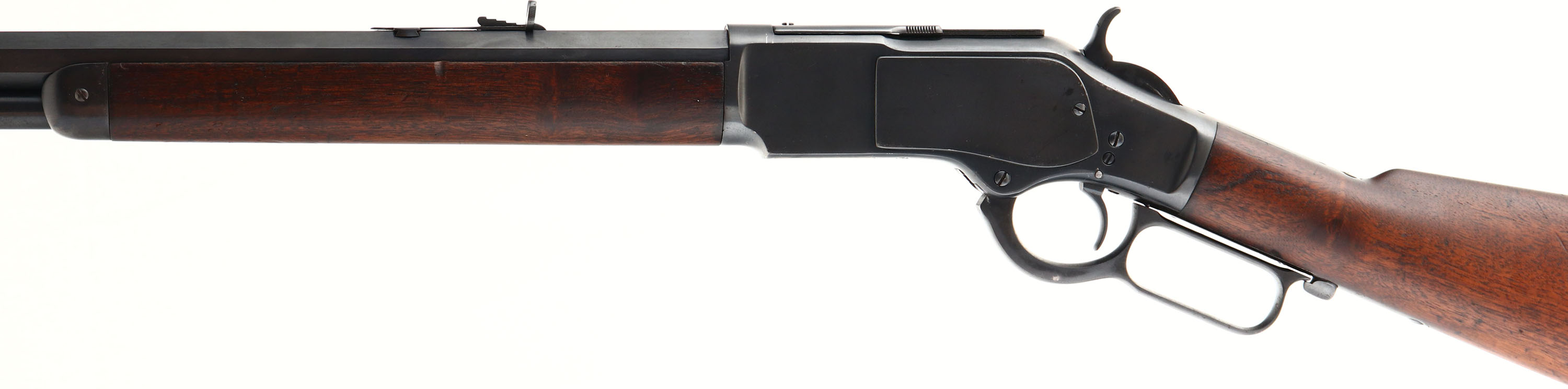 Winchester, Model 1873, 2nd Variation, CAL: 44-40, MFG: 1882, SN: 87244, Lever Action Rifle, 24 1/4'' Octagon barrel, Full mag. The original straight grip wood stock & forend are very good, displaying minor contusions, scrapes & dings. The stocks have possibly been lightly cleaned & reoiled, but carry the original. The metal carries a modern, professionally refinished blue, which rates 90% overall, with minor blemishes, buff polish lines & spotting under the blue. Bore is very good, but with intermittent pitting & spots of roughness amongst proud rifling. The barrel holds an adjustable rear sight & an altered pinched brass blade front sight. Stock carries a sliding trapdoor crescent metal buttplate. Action appears tight & smooth. Antique, No FFL Req. - Value: 1500 to 3000