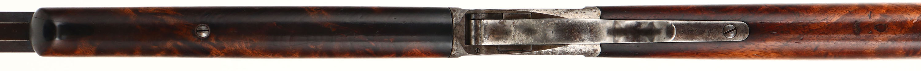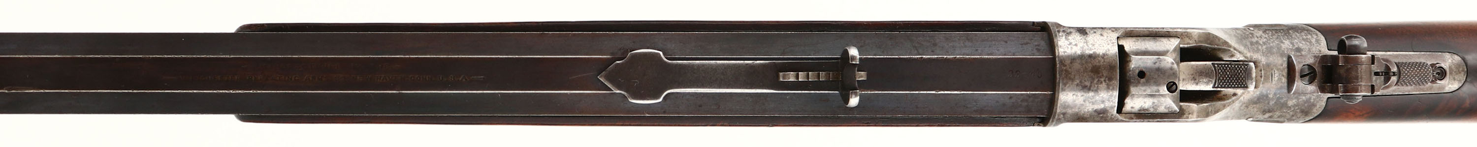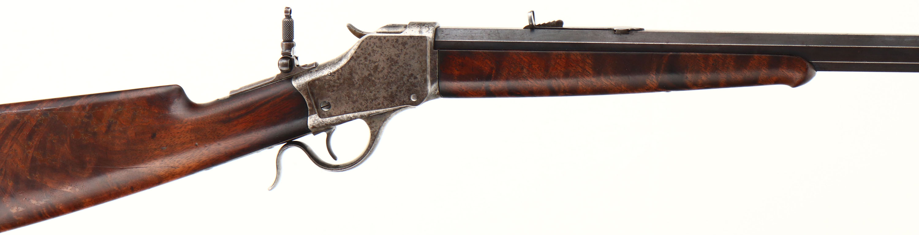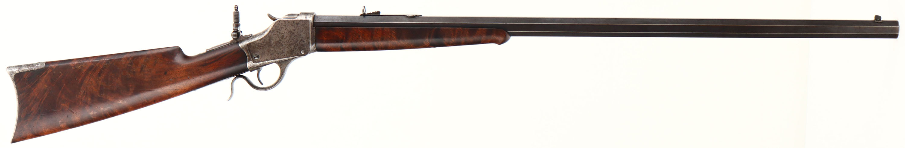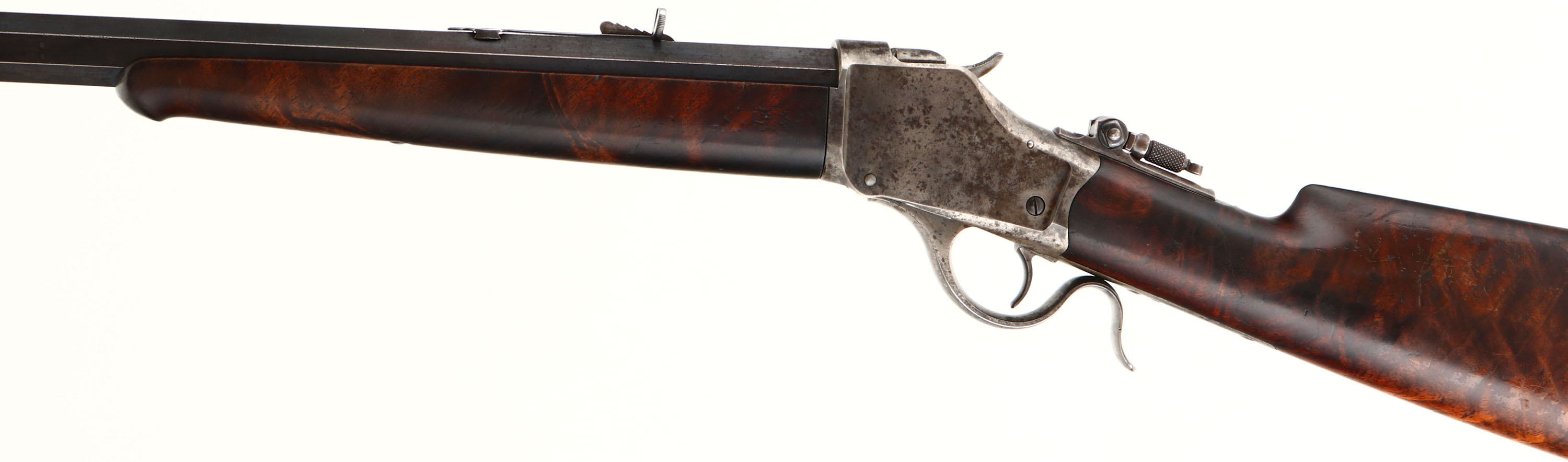 RARE, Winchester Model 1885 High Wall, CAL: marked 32-40, MFG: 1891, SN: 45048, Lever Action Falling Block Single Shot Rifle, 30'' #3 stamped octagon barrel. The Special Order straight grip Deluxe ''X'' grade wood stock & inlayed ebony tip forearm are excellent & rare. It is unusual to order non-checkered deluxe grade wood. The grain & contrast of the wood is fabulous. The finish shows thinning & flaking. There is two tight grain cracks on the left side of wrist emanating from the upper & lower tangs, an some other minor contusions, scrapes & scratcher. The barrel retains 70% coverage of original blue finish toning to a brown patina as it thins. The case-hardened receiver, level & hammer have all worn gun metal gray, with shadowy outlines of case-colors & spotty brown patina. The barrel is a #3 weight barrel, as stamped ahead of the forearm & under the forearm, as is the matching caliber marking. Bore is very good, with areas of roughness amongst the proud rifling. The receiver is fitted with a Lyman flip-up adjustable tang sight, while the barrel carries an adjustable rear & small blade front sights. Buttstock carries a smooth, crescent metal buttplate. Plain trigger. Comes with a Cody Winchester Factory Records Letter confirming the configuration, deluxe ''x'' wood & dates. A wonderful & original special order 1885 high wall. Antique, No FFL Req - Value: 4000 to 6000