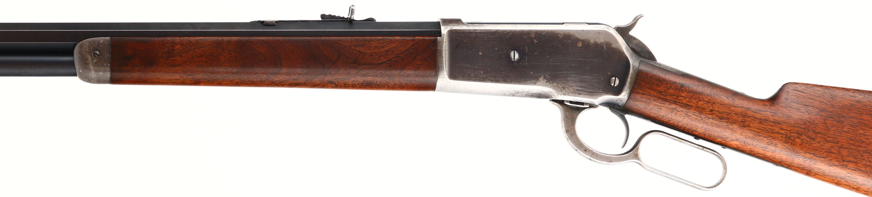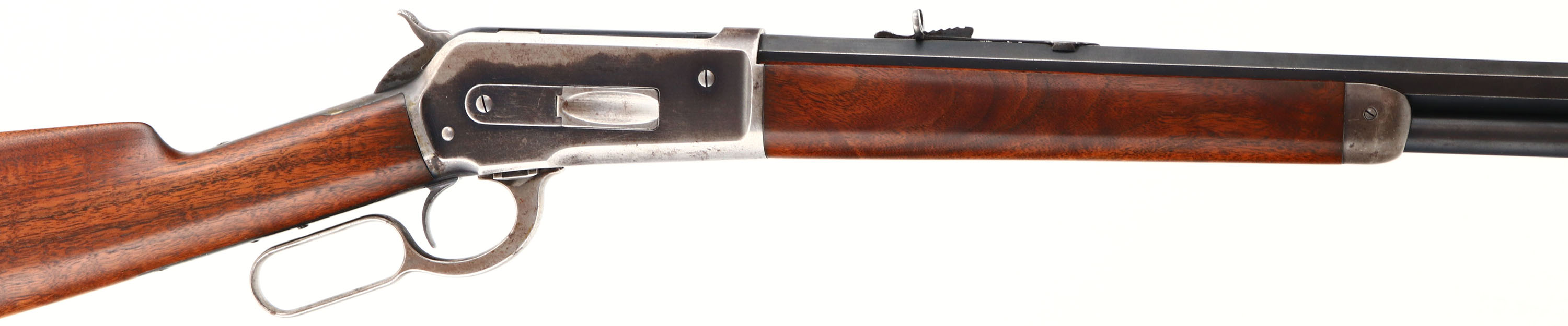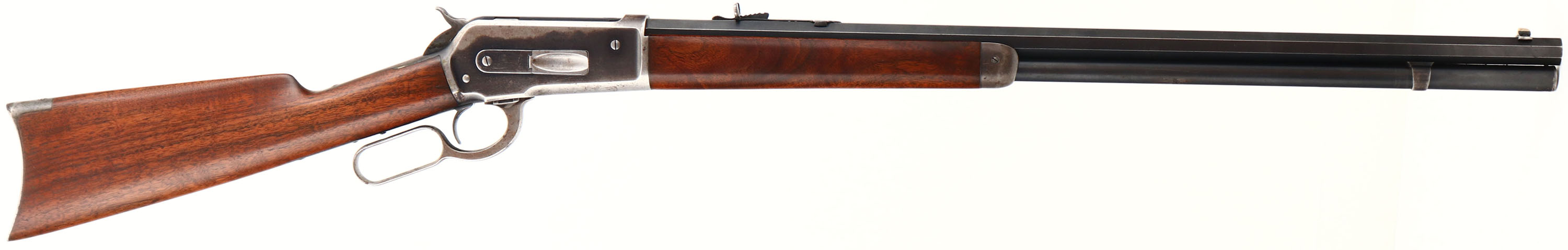Winchester, Model 1886, CAL: 45-90 WCF, MFG: 1903, SN: 130022, Lever Action Rifle, 26'' Octagon barrel, Full mag. The original straight grip wood stocks are excellent, as professionally cleaned or possibly lightly sanded in areas & restored finish mixed with the original finish. The stocks display some minor contusions & handling marks, The metal blue finish on the barrel & tube are very nicely & professionally restored rating 95% overall, with minor blemishes & scuffs. The receiver has toned a mix of gun metal gray, with approximately 25% remaining original blue. Bore is excellent & bright, with crisp rifling & very light spotting. The barrel holds an adjustable rear sight & pinched silver blade front sight. Buttstock carries a crescent metal buttplate. A very nice & still very collectible 1886 rifle. FFL or C&R Req. - Value: 2000 to 4000