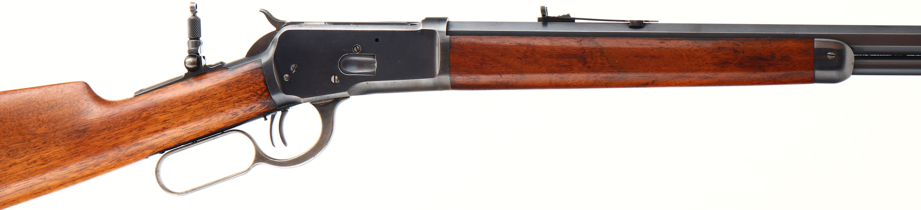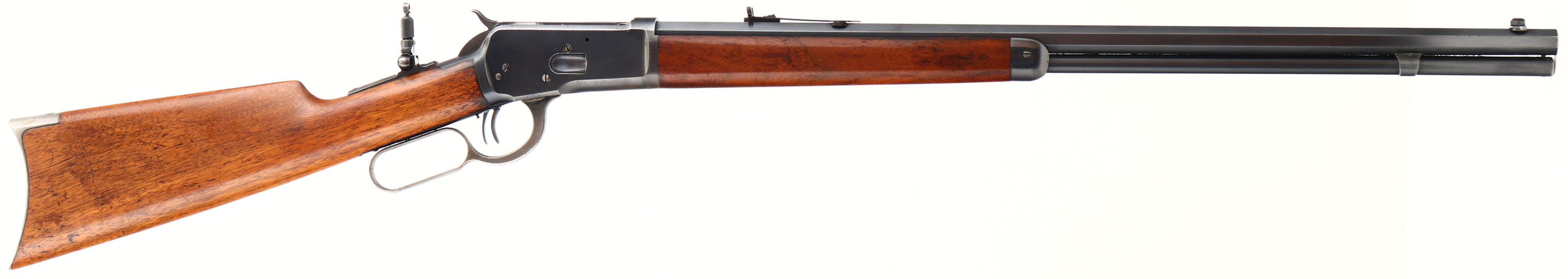 EXCELLENT Winchester, Model 1892, marked 32 WCF, MFG: 1908, SN: 422499, Lever Action Rifle, 24 1/4'' Octagon barrel, Full mag. The original straight grip wood stocks are excellent & solid, with the majority of factory finish remaining, Minor handling dings, scratches & blemishes. Metal displays 95% coverage of original blue on barrel & mag, 85% on receiver, with loss at natural carry points on belly of receiver. Some remains of case-colors on lever & hammer. Crisp barrel lettering & markings. Bore is excellent, but with a couple of spots of roughness. The rifle is fitted with an upgraded sight package of a Lyman flip-up tang sight, a folding leaf adjustable rear & an Ivory bead Lyman front sights. Stock carries a crescent metal buttplate. Special order double set triggers. Tight smooth action. An excellent, all original, & highly collectible special order 1892.* FFL or C&R Req. - Value: 4500 to 6500