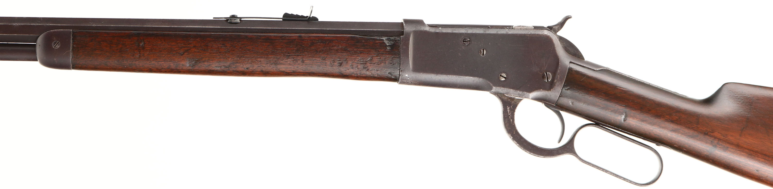 Winchester, Model 1892, CAL: 32 WCF, MFG: 1892, SN: 12X410, Lever Action Rifle, 24'' Octagon barrel, Full mag. The original straight pistol grip wood stock & forend are good & solid, as sanded & refinished. They display edge chipping, contusions, scrapes & dings. The metal finish has toned entirely to an even chocolate brown patina. Barrel has been re-lined & thus the bore is excellent & bright, with crisp rifling. The barrel holds a replaced adjustable rear sight & pinched silver blade front sight. Buttstock carries a crescent metal buttplate. Smooth tight action. Should be an excellent shooter. Antique, No FFL Req. - Value: 600 to 1200