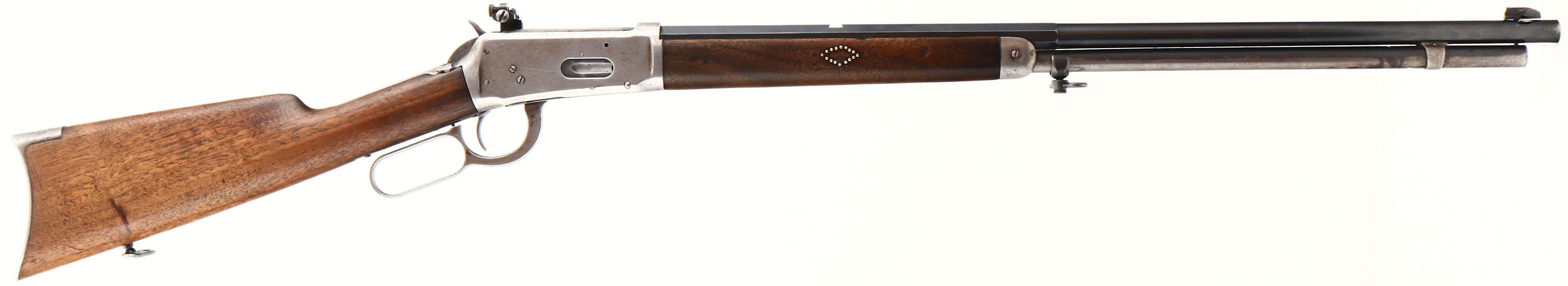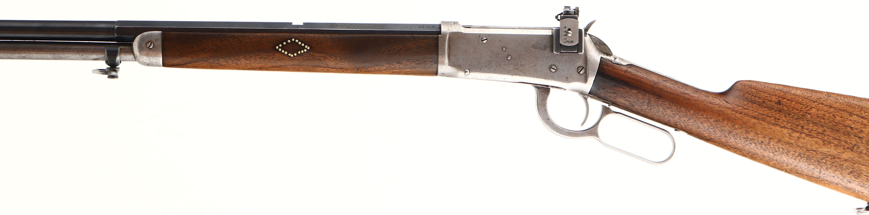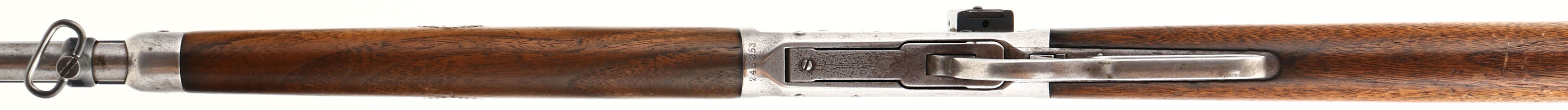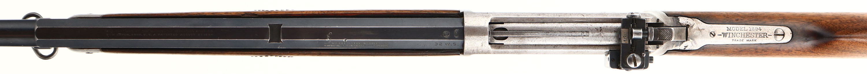 Winchester, Model 1894, CAL: 32 W.S, MFG: 1902, SN: 245243, Lever Action Rifle, 25 1/2'' Half octagon half round barrel. The original straight grip wood stock & forend are good. The stock has a couple of 2'' cracks at the toe, along with a bit of edge chipping, minor contusions & scrapes. The forend has brass decorative pins either side in a diamond configuration & has a couple of short hairline cracks on the right side, as well as other contusions & dings. The barrel is a ''Winchester'' marked replacement, with a circle ''P'' stamp. The factory metal blue finish on the barrel rates 85%, with some scuffs & blemishes. The receiver & tube has worn to gun metal gray, with thin brown patina in protected areas. The upper tang was damaged & has a weld repair behind the hammer. Bore is excellent & bright, with crisp rifling. The barrel has a open rear dovetail & a Marbles Sheard blade front sight. The receiver holds a side mounted Lyman 66A peep sight. Buttstock carries a crescent metal buttplate. Sling loops on stock & mag. FFL or C&R Req. - Value: 400 to 800