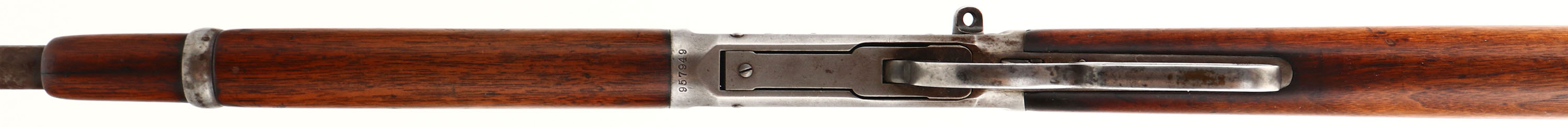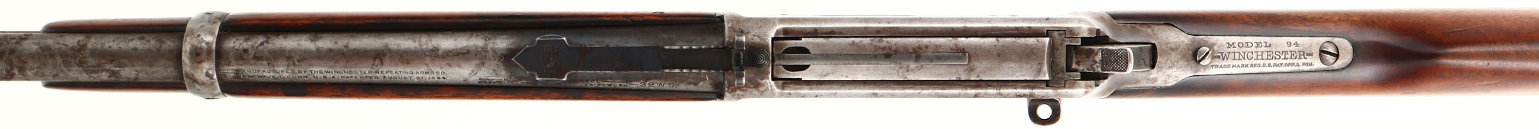 Winchester, Model 94 SRC, CAL: 32 W.S., MFG: 1925, SN: 957949, Lever Action Rifle, 20'' Round barrel, Full mag. The original straight grip wood stocks are good & solid, as lightly sanded & reoiled. The stock has an edge chip at the heel, & both has minor contusions, scrapes & dings. The metal blue finish has worn to a gun metal gray, with a thin, spotty layer of brown patina. Bore is very good, moderately rough, with proud rifling. The barrel holds a replaced adjustable rear sight & block elevated blade front sight. Stock carries a carbine style metal buttplate. Saddle ring is missing. FFL or C&R Req. - Value: 400 to 800