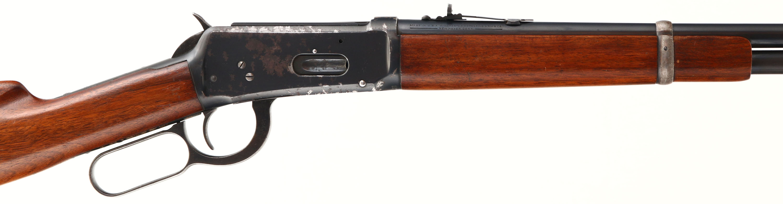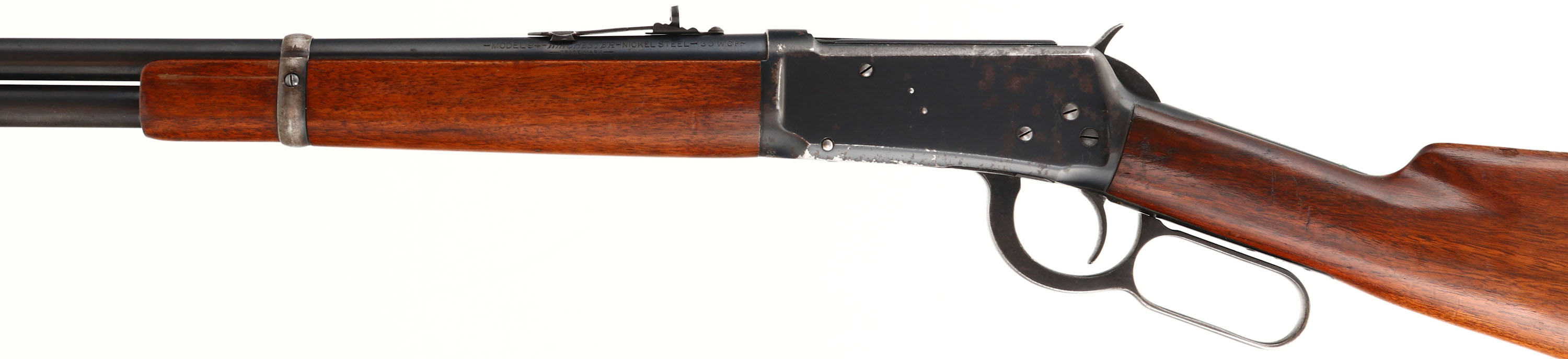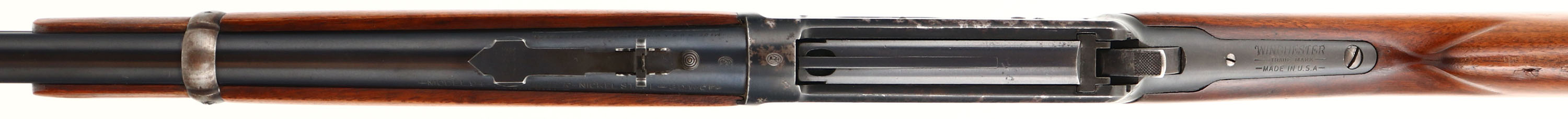 Winchester, Model 94, CAL: 30 WCF, MFG: 1928, SN: 1042328, Lever Action Rifle, 20'' Barrel, Full mag. The original straight grip wood stock & forend are excellent, displaying small scrapes, dings & contusions to the original finish. The original metal blue finish on the barrel rates 95%, 80% on the tube toning to a brown patina as it thins. The receiver rates 70%, with large spotty areas of flaking toning to a brown patina. Bore is excellent, with crisp rifling. The barrel holds a Marbles adjustable rear sight & Lyman blade front sight. Stock carries a smooth metal buttplate. FFL or C&R Req. - Value: 300 to 600