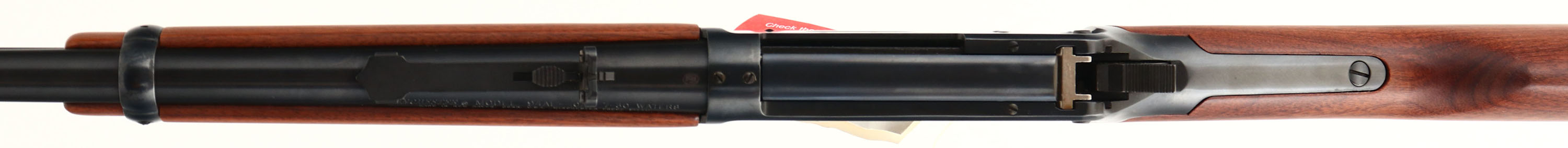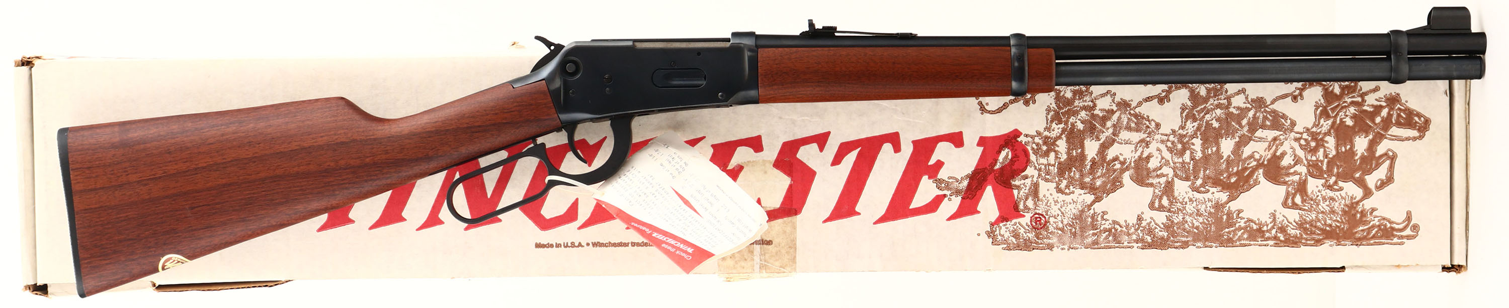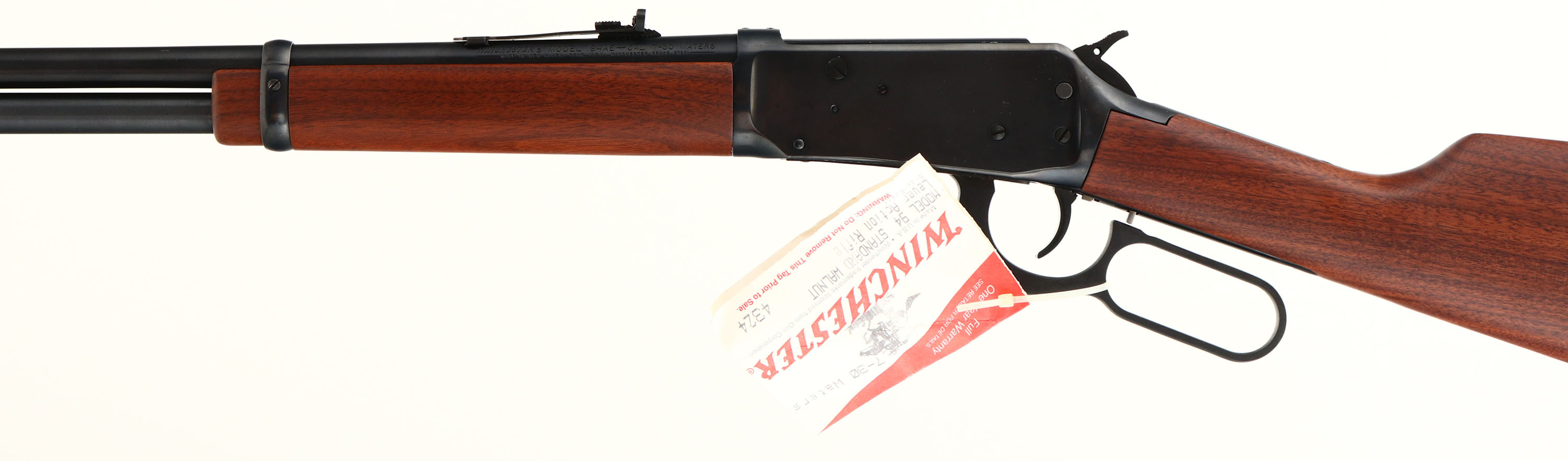 BOXED, Winchester, Model 94 AE Carbine, CAL: 7-30 WATERS, MFG: 1980's/Modern, SN: 6000721, Lever Action Rifle, 20'' barrel, Full mag. The original straight grip wood stocks are near mint, & still carry the factory ''Walnut'' decal on the belly of the stock. The metal blue finish rates 99%+ overall. Bore is mint. Doesn't appear to be fired outside the factory test fire. The barrel holds an adjustable rear sight & hooded blade front sight. Stock carries a Winchester checkered plastic buttplate. Comes in non-matching SN, but correct model factory box, with hammer extension & paperwork. Gun still has stickers & original hang tag. A NIB modern 94 in a rare & seldom seen caliber. FFL Req. - Value: 600 to 1200