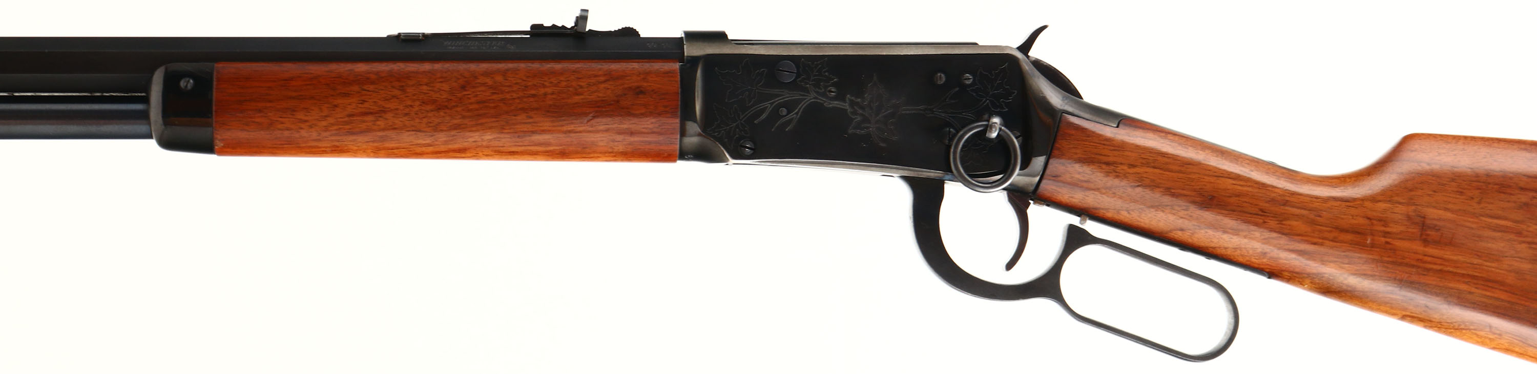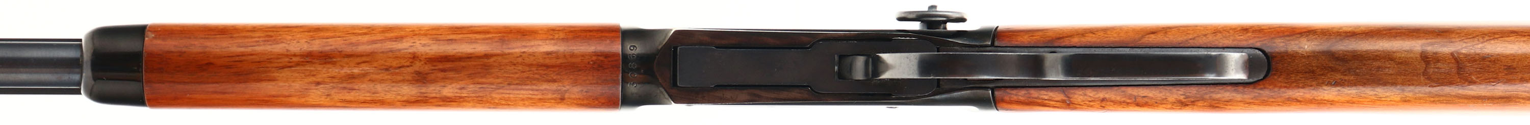 Winchester, Model 94 Short Rifle, Canadian Centennial Commemorative, CAL: 30-30, MFG: 1967, U.S.A. produced, SN: 30868, Lever Action Rifle, 20'' Octagon barrel, Full mag, The straight grip wood stocks are excellent, displaying minor contusions, scrapes & dings. The stock shows some water staining & finish damage to the stock near the buttplate. The factory high gloss metal blue finish rates 98%, displaying minor blemishes & light spotting. The sides of the receiver have Canadian themed (maple leaf) machine engraving. Bore is excellent & bright, with sharp rifling. The barrel holds a factory adjustable rear sight & tall blade front sight. Stock carries a crescent metal buttplate, which was also water damaged & has been refinished. Factory saddle ring. FFL or C&R Req. - Value: 500 to 1000