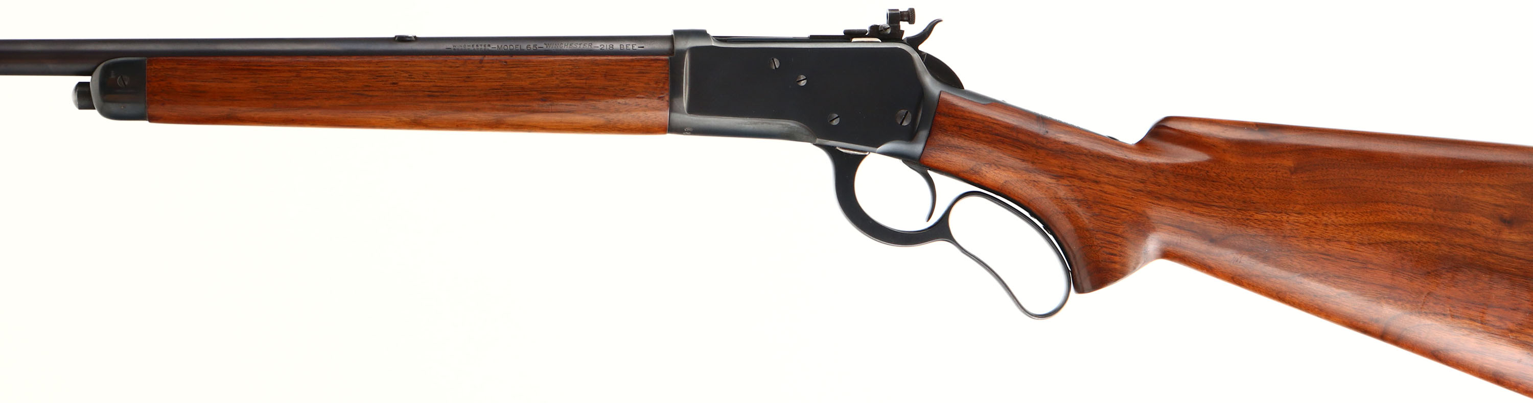 RARE & EXCELLENT Winchester, Model 65, marked 218 BEE, MFG: 1941, SN: 1007321, Lever Action Rifle, 24'' Round barrel, mag holds 7 rounds, This is one of the rarest & fewest made Winchester models of all models produced, with only 5,704 total rifles. The rifle was evolved from the model 58 & production started 1933 & ending in 1947, with the 218 Bee caliber added mid production in 1939. While .25-20 caliber rifles are the rarest, 218 Bee examples are in highest demand amongst collectors & command premium values. The original wood stocks on this example are excellent & solid, displaying nearly all the original finish with few tiny handling marks. The original metal blue finish on the barrel rates 98%, 95% on the receiver, with most wear loss on the belly of the receiver. The rifle carries the rare factory bolt receiver sight, with blank filled rear dovetail & hooded front sight, The factory checkered metal widow's peak buttplate retains 95% of the original blue. Excellent bore. A superb, all original condition, rare model 65 in the most desirable caliber. Definitely a collector's quality rifle.* FFL or C&R Req. - Value: 7500 to 9500