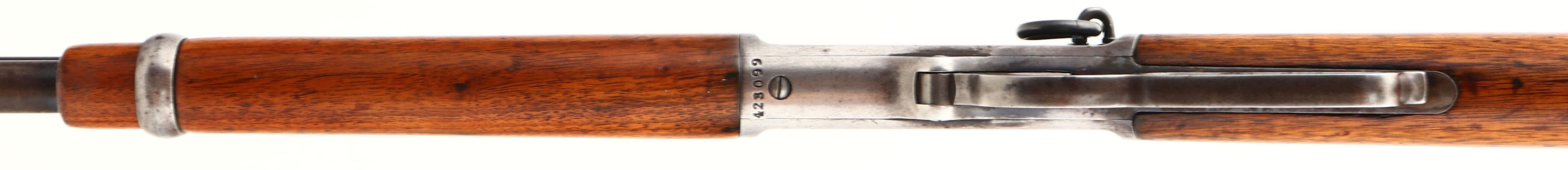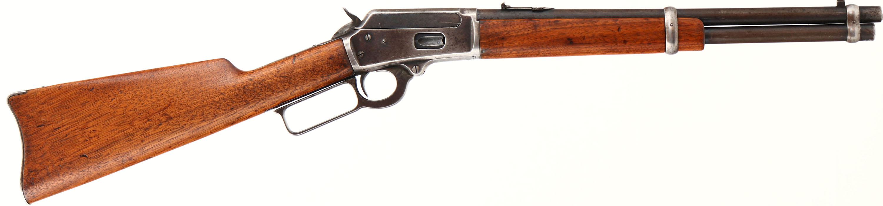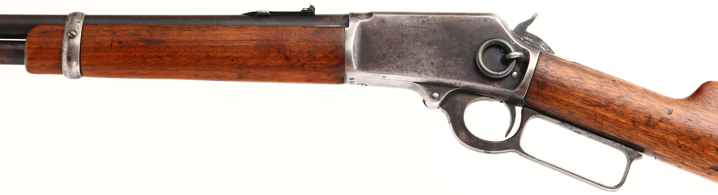 RARE Marlin, Model 94 SADDLE RING TRAPPER, CAL: 44-40, MFG: 1905-34, SN: 423099, Lever Action Carbine, 15'' barrel & mag. This is an extremely rare short barreled trapper which has be recognized by the ATF as qualifying as a curio & relic & is listed by serial number in the ATF C&R booklet as approved as a short barreled rifle (SBR) removed from NFA restrictions. In other words, this carbine is a legal SBR carbine. The original straight grip wood stocks are very good & solid. They carry a thin layer of added finish over the original finish, with several small nicks, scratches & minor contusions. The metal blue finish on the barrel & tube has toned to a brown patina, with some remains of original blue in protected areas. The once blued receiver & case-hardened lever have worn mostly to a gun metal gray, with a thin layer of brown patina. Bore is clean & bright, but with little remaining rifling. The barrel holds a roll over rear sight, with two additional leafs, stamped with a 50 for 50 yds & a 1 & 2 on subsequent leafs for 100 & 200 yds. The front sight is a carbine style small blade on box. Buttstock carries a carbine metal buttplate. Staple saddle ring. These little trappers were extremely popular on the early traplines & are highly desired & collectible amongst lever collectors. FFL or C&R Req. - Value: 4000 to 6000