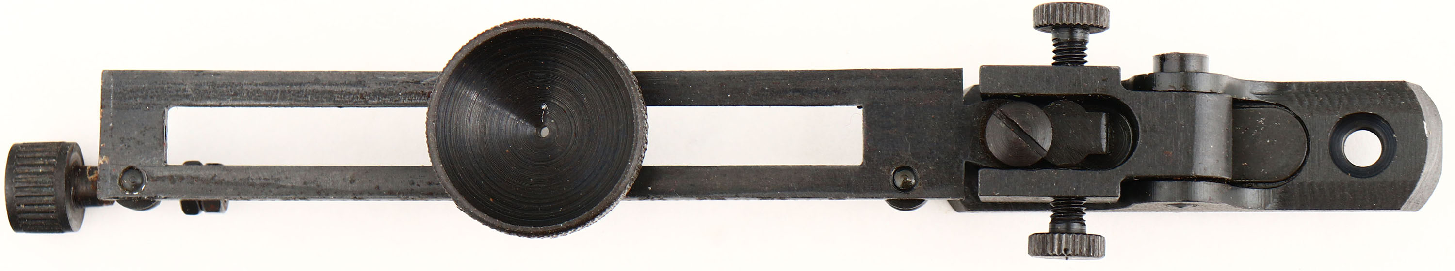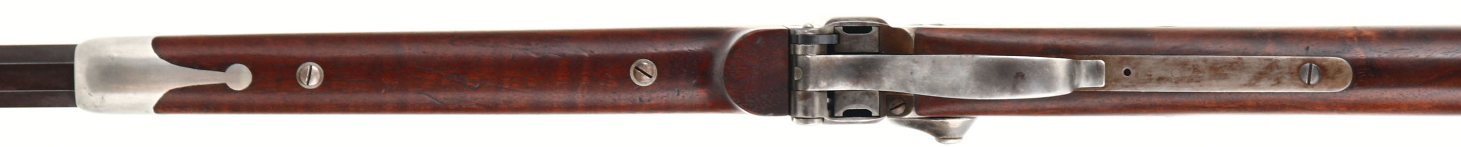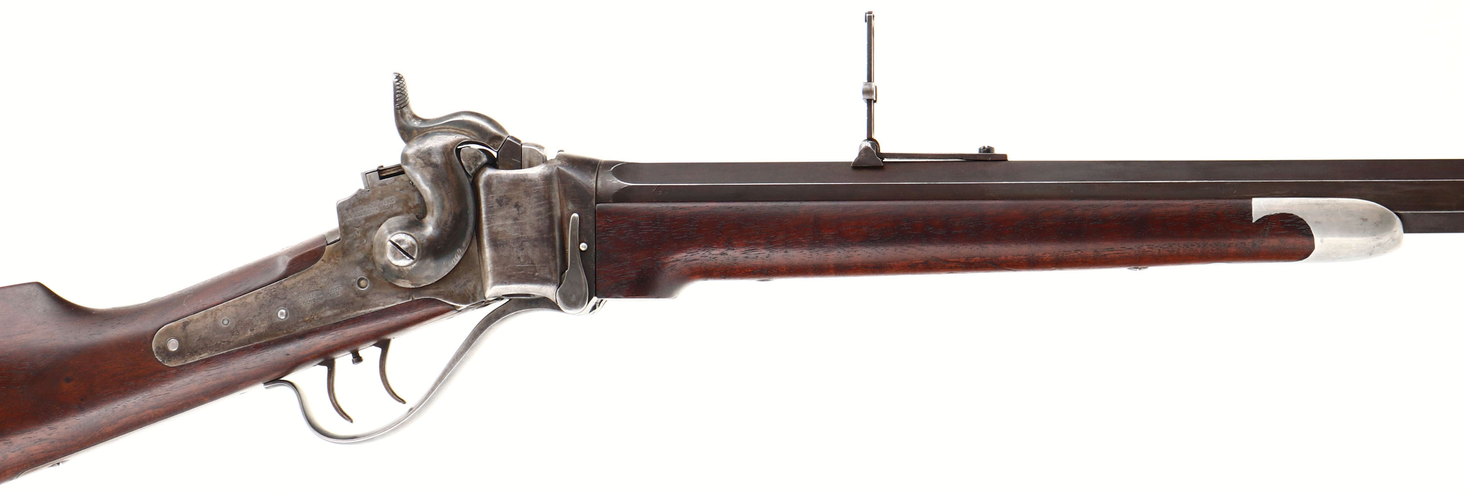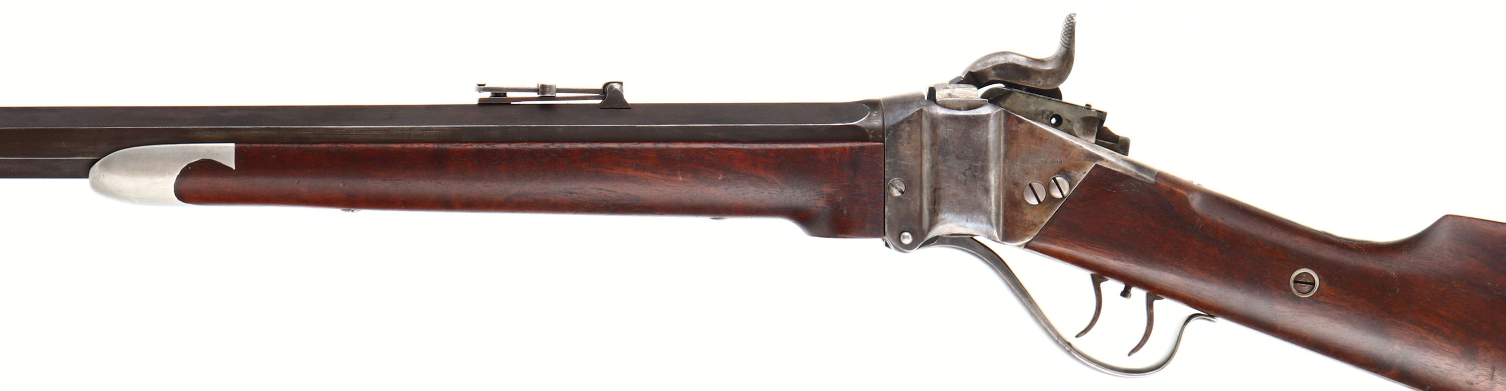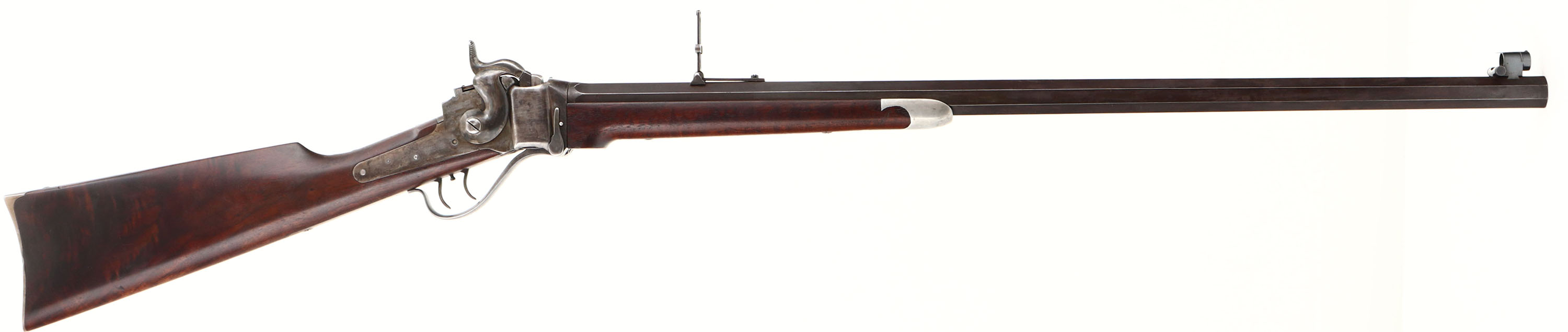 CUSTOM CONVERSION Sharps Sporting Rifle, CAL; 45-120, MFG: N/A, SN: 90699, Lever Action Falling Block Single Shot Rifle, 29 3/4'' octagon barrel. This rifle started life as 1863 Military Purcussion carbine. These military carbines were later converted for a 50-70 centerfire matalic cartridge between Feb. 1868 & Oct., 1869 by Sharps Rifle Manufacturing Co. for the government according to the contract Nov. 2, 1867. A new breech block replaced the percussion type for use with these metalic catridges. In the late 1870's these converted rifles were sold off by the military & many of them were again reconfigured for the civilian market by Sharps & other well known specialty shops. This example has been reconfigured to resembled the popular & rare Sharps 1869 Sporting Rifle. The custom straight grip wood stocks are excellent. They display highly figured & beautiful grain & a rich hand rubbed oil finish. The forend has a pewter/silver inlaid Sharps rifle style tip. The finish is overall excellent, displaying minor dings & scrapes. The barrel has an antique flat rust chocolate brown finish. The case-hardened receiver has worn mostly gun metal gray, with shadowy remains of case-colors & actual colors remaining in protected areas. The barrel is stamped ''Old Reliable'', address stamped ''SHARPS RIFLE CO. BRIDGEPORT, CONN.'' & ''CALIBRE 45''. Consignor indicates the barrel is confiugured for a 45-120 cartridge, with an excellent, bright bore, with sharp rilfing. The receiver shows the correct Sharps & Lawrence stamps on the lockplate & right receiver, & the Sharps 1848 patent stamp on the left is still partially visible. The left side of the receiver carries a slotted filler screw where the saddle ring bar once resided. The SN is stamped on the upper tang & on the underside of the barrel under the forend. The barrel holds a ''R. S. Lawrence'' style flip-up ladder rear sight, with graduations from 1 to 8 & a Sharps windage globe sight, with bubble spirit level. The glass cylider in the sight is of the early plum color, but does not have any liquid remaining. The stock carries a smooth crescent metal buttplate. Double set triggers. The mechanics all appear very good. Rifle comes in a custom green case, with brown leather accents, straps & burgundy interior. Includes in the case is a tall sliding aperature disc tang sight, with screws. This is an excellent looking Sharps Conversion Sporting Rifle. Antique, No FFL Req. - Value: 3000 to 6000