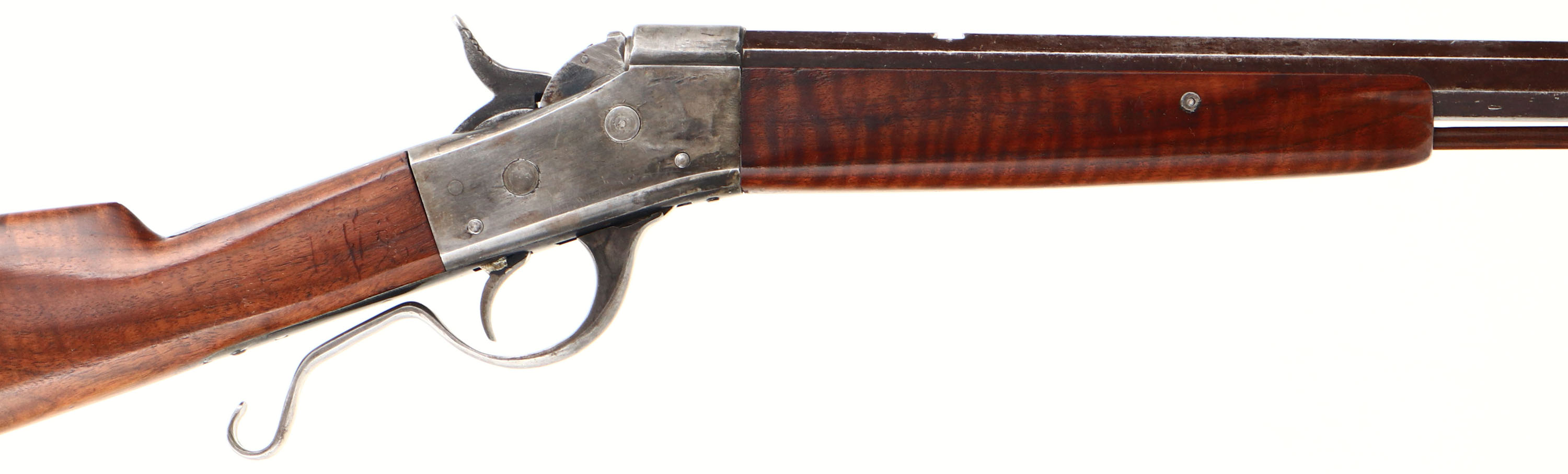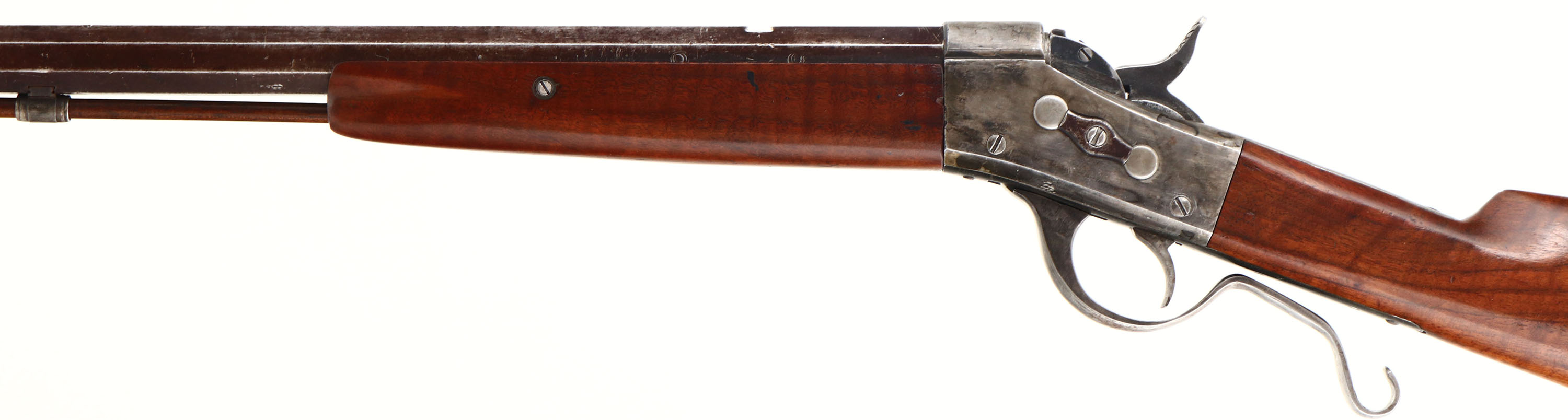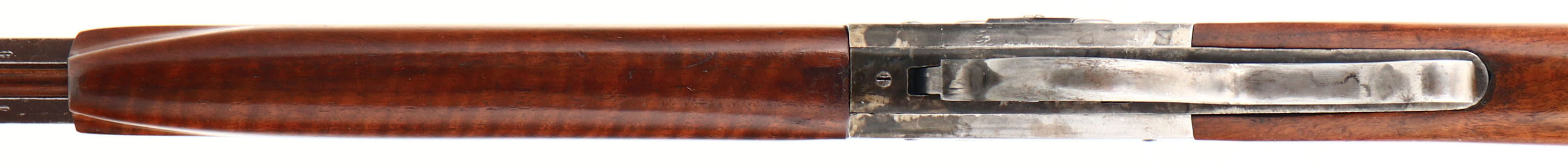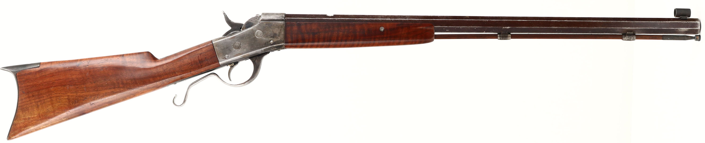 CUSTOM, Rolling Block, CAL: 40-60 WCF, MFG: N/A, SN: None Lever Action Single Shot Rolling Block Rifle, 25 1/2'' octagon barrel. This is a very unique ''Fruen'' custom built lever action rolling block rifle, which appears to be built on a Remington model 1 1/2 rolling block receiver. The lever conversion functions to simple drop the block to allow for greater access to extract the spent shell. This proved to be very useful & successful for quicker reloading, which was critical for both game hunting or to defend one self. The custom straight grip wood stocks are excellent, with very nice wavy grain & excellent finish. There is a tight 1'' hairline crack on the right side of wrist, along with other minor contusions & scrapes. The barrel carries no makers address other than the 45-60 WCF caliber marking. The metal finish on the barrel has toned to a chocolate brown patina, with worn areas being gun metal gray & with remnants of blue in protected areas. The receiver was likely case-colored at one time, but currently carries the thin remains of added finish. Bore is excellent & bright, with crisp rifling. The barrel has a open rear dovetail & a hooded front sight. The upper tang is tapped, with two open screw holes from a previously mounted tang sight. There is a hickory cleaning rod secured within the forend & under the barrel with two dovetailed retaining loops. Buttstock carries a deep crescent metal buttplate, with long upper tang. A unique & nicely built custom lever rolling block rifle. FFL or C&R Req - Value: 1000 to 2000