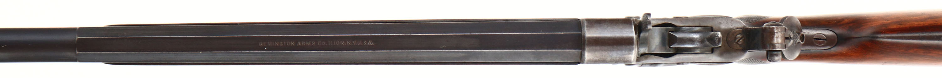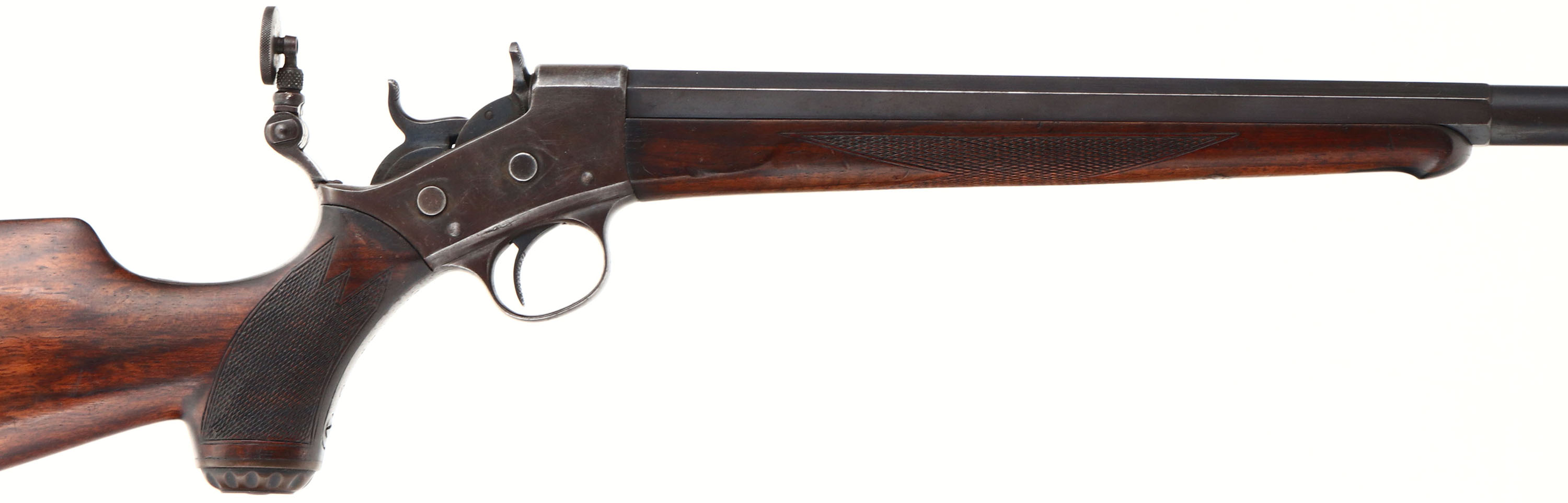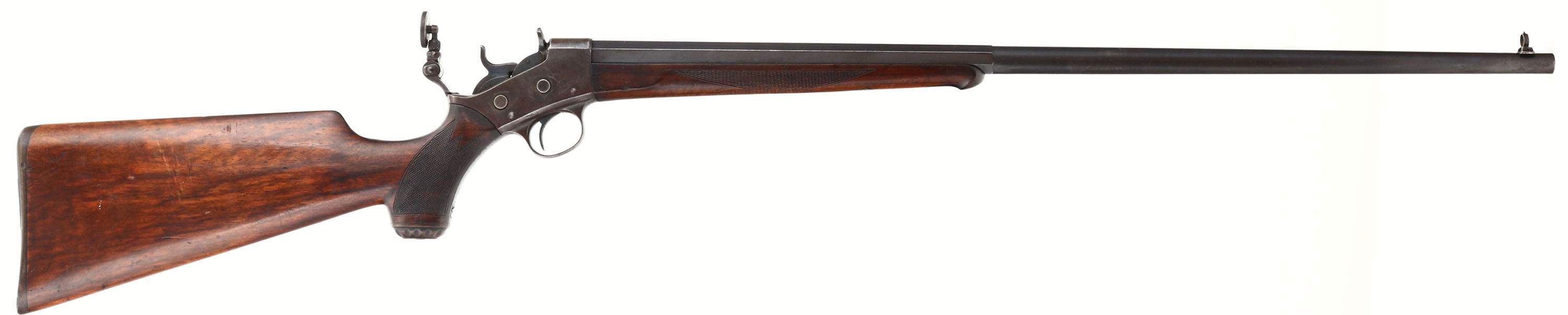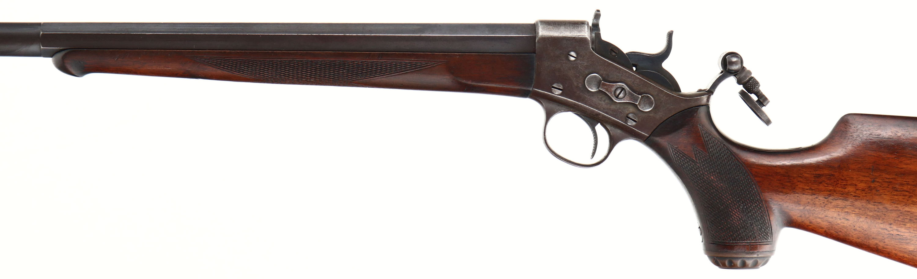 SCARCE! Remington, No. 7, CAL: 22 S, MFG: 1903-10, SN: 300086, Single Shot Rolling Block Rifle, 26 3/8'' half octagon/half round tapered barrel. Manufactured on Remington Model 1871 SS pistol action frames. This was Remington's last rolling block rifle, with approximately, just 350 No. 7 rifles manufactured in all variations. Chambered in .25-10 Stevens, .32 & the .22 short or long rifle rimfire cartridges, the short has become most popular amongst collectors. The original finely hand checkered & capped pistol grip wood stocks, with ebony forend inlay, are excellent, displaying the majority of the original finish, & very minor contusions, scratches & scrapes. The end & inside of the forend are marked with ''86'' as matching partial of the SN. The barrel is also stamped with the same ''86'' under the forend & 22S caliber marking in front of forend. The original metal blue finish on the barrel rates 95%, with some light speckling. The receiver has toned to a mix of brown patina & metal gray in areas of wear. Bore is very good, some light spotting amongst strong remaining rifling. The barrel carries a flip-up globe front globe sight & the rear of the receiver carries a special flip-up Lyman tang sight, with large aperture disc. Buttstock carries the original checkered buttplate. Checkered trigger. An original & excellent example of a very rare No. 7 Rolling Block Rifle. FFL or C&R Req. - Value: 4000 to 8000
