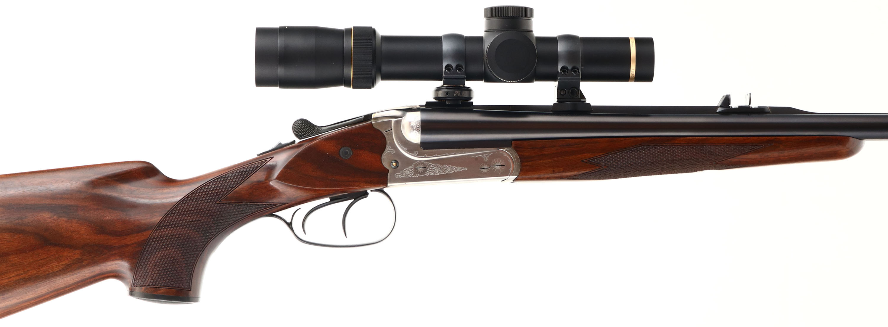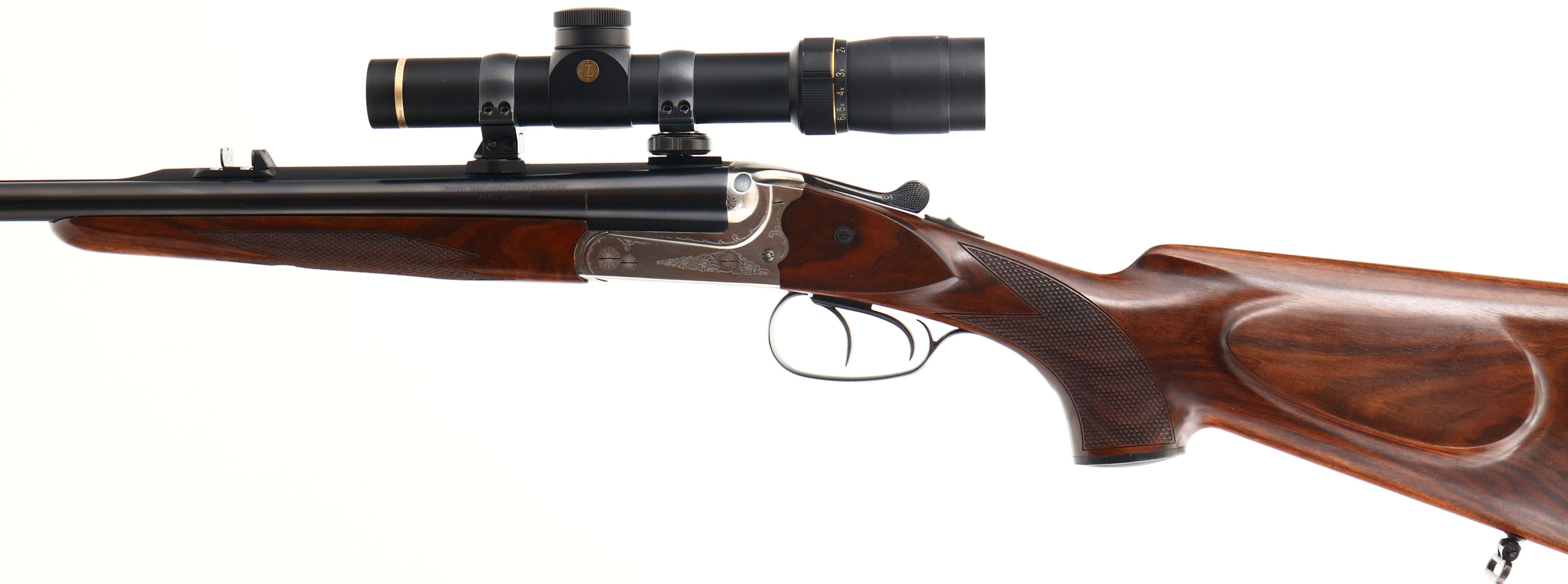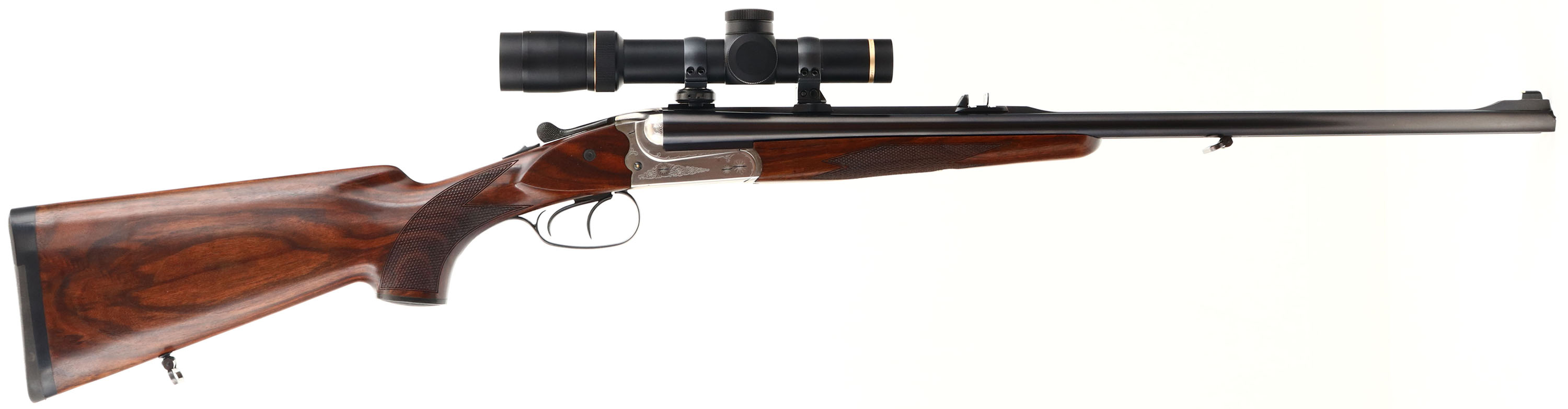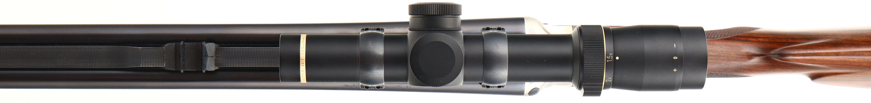 Merkel, Model 140-2, CAL: 375 H&H MAG, MFG: Modern, SN: A375301, Break Action SxS Rifle, 23 5/8'' barrel. Merkel guns are truly custom, hand-made, master-engraved & all made to customers' specific orders. A safari hunting rifle must be robust, accurate & reliable & the Merkel 140 Safari Double Rifle easily surpasses these requirements. It offers a combination of aesthetics & functionality based on over a century of gun-making experience. In terms of performance, the 140 Safari Double Rifle provides exceptional accuracy & an instant follow-up shot. The checkered, cheeked & capped pistol grip wood stocks are excellent. The stock displays an attractive grain pattern, with only a couple minor handling marks to the finish. The metal blue finish on the barrel rates 99% overall. The polished stainless steel finish on the receiver is excellent. The receiver, trigger guard & break lever display a simple ornamental engraving. Bores are excellent & minty. The receiver also carries a Leupold VX-7 1.5-6x24mm scope. The barrel holds a dual folding leaf rear sight & ramped blade front sight. Buttstock carries a solid black rubber recoil pad. Sling loops present. A very high condition example of a Merkel Safari rifle. FFL Req. - Value: 5000 to 9000