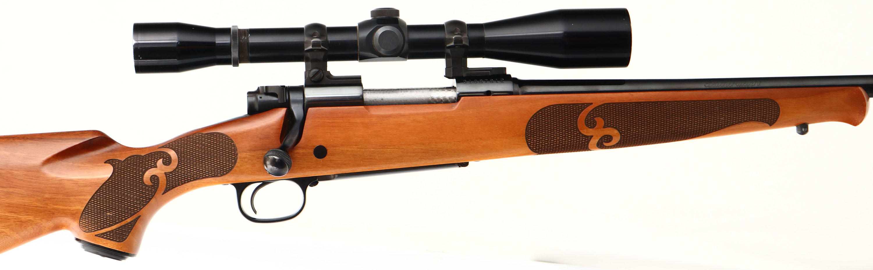 Winchester, Model 70 SA Featherweight, CAL: 22-250 REM, MFG: 1988, SN: G1887812, Bolt Action Rifle, 21 3/4'' barrel. The original checkered & capped pistol grip wood stock is excellent, displaying minor contusions & handling marks to the original finish. The metal blue finish rates 98% overall, with small scuffs & blemishes. The blue on the floorplate appears to be restored, with tiny speckles of rust pitting below the blue. Bore is excellent & bright, with sharp rifling. No open sight provisions. The receiver holds a Perma-Center All American 6x scope. Buttstock carries a Winchester solid rubber recoil pad. Sling stud. An excellent Model 70 Featherweight. FFL Req. - Value: 700 to 1200