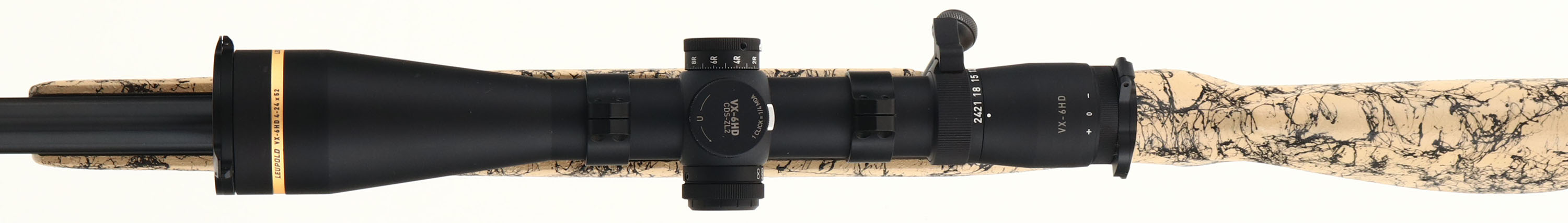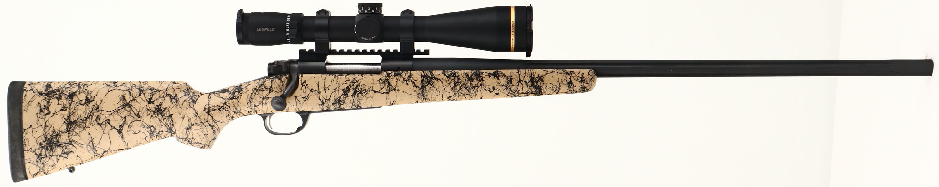 CUSTOM, Winchester, Model 70, CAL: 7mm WSM, MFG: Modern, SN: G2424314, Bolt Action Rifle, 27'' barrel. The custom, cheeked & flat pistol grip synthetic stock is excellent, It carries a wonderful desert tan & black accent finish, with a Jackson Pollock nod, which is also excellent. The custom fluted barrel has a matte, dark gray finish, which is excellent. The matte black finish on the receiver rates 95% overall, with minor surface scuffs. Bore is excellent, with sharp rifling. The picatinny rail on the receiver carries a Leupold VX-6HD 4-24x52 scope & no open sight provisions on barrel. Stock carries a solid black rubber recoil pad. Single sling stud in stock, open hole in forend. A fully customized & nicely equipped Winchester action rifle. FFL Req. - Value: 1000 to 2000