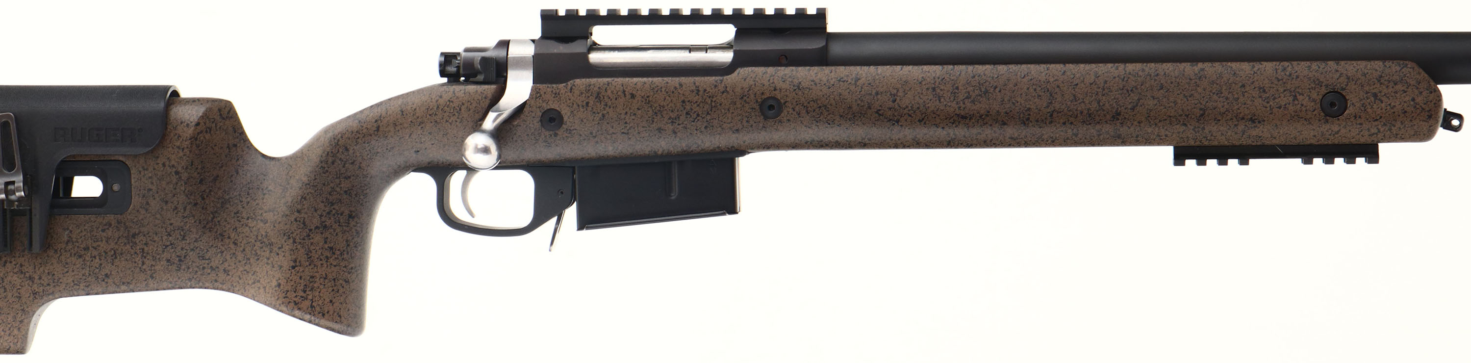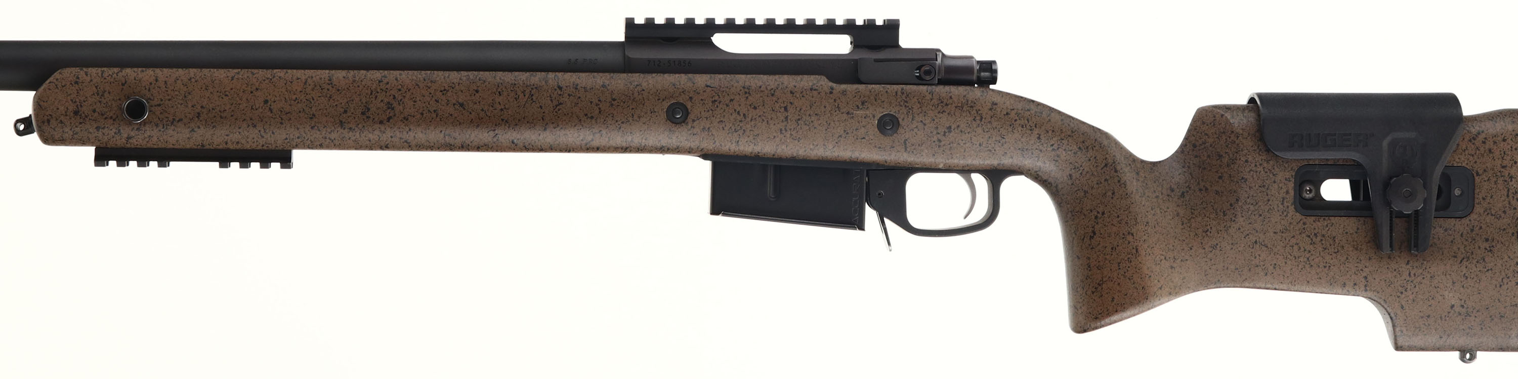 Ruger, Model M77 Hawkeye Long-Range Target, CAL: 6.5 PRC, MFG: Modern, SN: 712-51856, Bolt Action Rifle, 26'' Round barrel (27 5/8'' w/ muzzle brake). The brown & black speckled composite target stock is excellent, with a small green painted square on the stock behind the bolt. It features a two-way adjustable comb, adjustable length of pull with multiple spacers & soft rubber buttpad, QD attachment points & flush-mounted lower M-LOK rail. The matte black finish on the barrel & receiver rates 97% overall, with light scuffs & slight discoloration near the muzzle. There is a Bore is excellent & bright, with sharp rifling. No open sight provisions. Receiver currently holds a 5 3/8'' picatinny rail. The lower M-LOK carries a 3 7/8'' picatinny rail. The heavy contour target barrel features a Ruger Precision: Rifle Hybrid Muzzle Brake. Detachable Ruger Accurate-Mag. Two-Stage adjustable trigger. Sling stud. A lightly used target rifle, ready for the range! FFL Req. - Value: 1000 to 1600