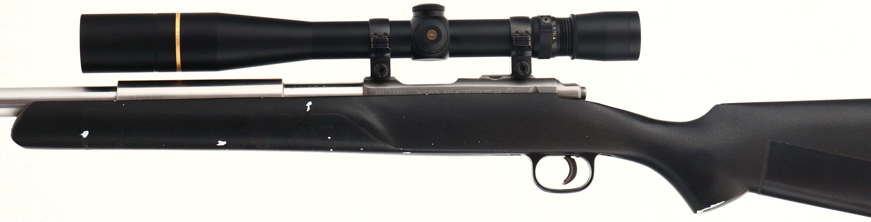 Ruger, All Weather 77/22, CAL: 17HMR, MFG: 2001, SN: 702-50482, Bolt Action Rifle, 22 1/8'' barrel. The custom & flat pistol grip synthetic stock is very good. The stock displays small areas of worn or scraped off texture finish, with an adhesive protective pad running the length of the belly of the stock. Originally calibered in .22, the new custom ''HAPHEY'' .17HMR stainless steel heavy target barrel is excellent. The satin silver receiver is also excellent. Bore is excellent. The receiver carries a Leupold VX-III 6.5-20x40mm Long Range scope, with no open sight provisions on the barrel. Adjustable trigger, currently set to under 1lb trigger pull weight. Stock carries a solid black rubber recoil pad. A very good customized long range target rifle built on the Ruger platform. FFL Req. - Value: 600 to 1200